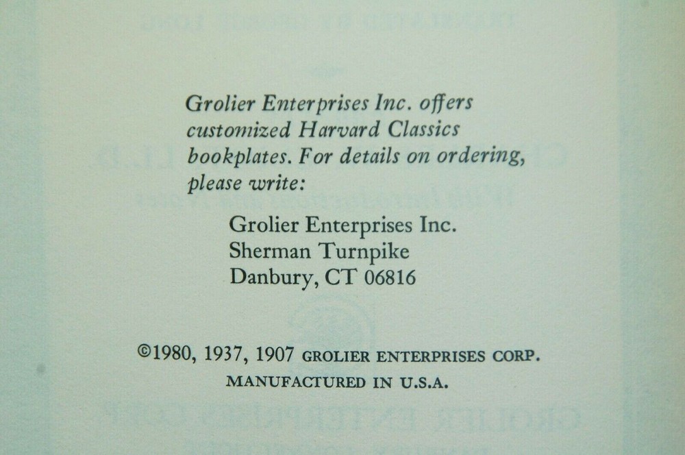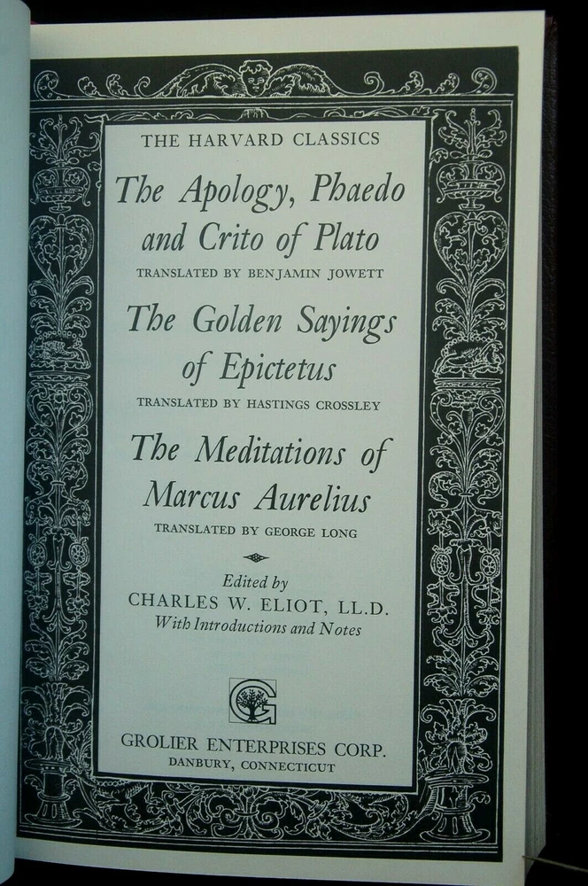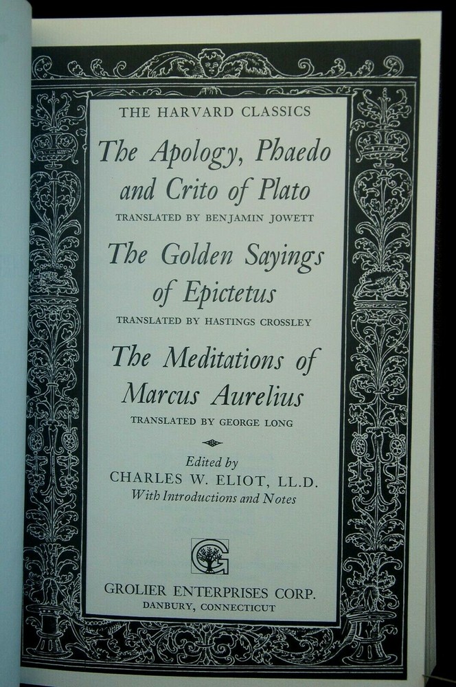 Harvard Classics Plato Epictetus by Marcus Aurelius ELIZABETHAN DRAMA 1980 Edition, New, Leather Bound, Hard Cover 5 Compartments with 4 Raised Bands -- Spine Gilt Lettering Perfect Condition Grolier Collector Series Grolier Enterprises Edition The Apology, Phaedo and Crito of Plato: Translated by Benjamin Jowett The Golden Sayings of Epictetus: Translated by Hastings Crossley The Meditations of Marcus Aurelius: Translated by George Long ESTATE SALE FIND: Book appears to have NEVER BEEN READ Please look at ALL photographs of actual item offered/described Glad to answer questions Thank you for looking Your feedback is appreciated Will combine items for shipping savings -- please message in advance w/ this request HURRY BACK -- NEW ITEMS LISTED WEEKLY!!!