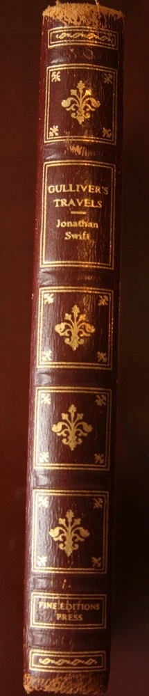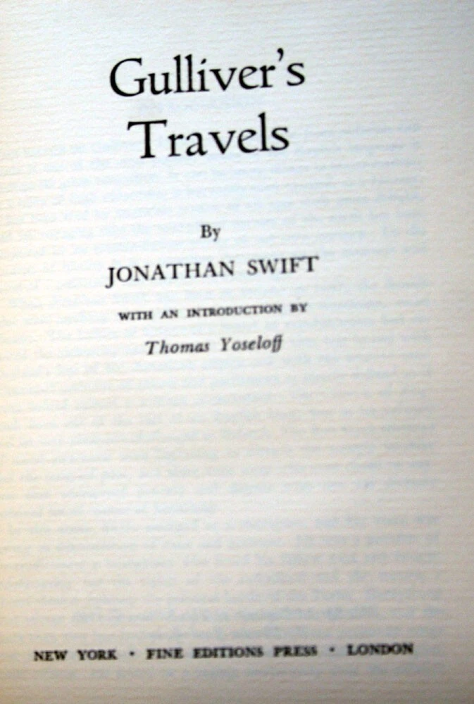 Description Gulliver's Travels by Jonathan Swift. Lovely vintage book published in 1957 by Fine Editions Press. Hardcover with leather spine. Light cover wear, binding secure, sticker at front endpaper. Books will be packed securely for safe shipment. Books will ship via USPS Media Mail, unless otherwise requested. If you would like to upgrade to an expedited shipping method, please contact me for a quote. Please view the photos and contact me with any specific questions. M2 **Please contact me with any questions prior to bidding. Check out my other listings now!** ***Please note: If you are bidding on a used or antique book... We do our best to accurately describe each book and identify any flaws it may have. If you have specific questions regarding its condition, please never hesitate to ask. Unfortunately, we cannot always inspect each page, and therefore grading is from visual inspection and browsing through the book. Unless stated otherwise, our books will contain signs of wear and age which is normal within the vintage/antiquarian category. We offer primarily used, vintage and antique books. Our books are stored in a dry, 100% smoke-free environment . We will always mention if a book has a noticeably unpleasant odor, however if you have a particularly sensitive sense of smell, we cannot recommend that you purchase any antique or vintage books. Payment Paypal Accepted. Shipping FREE USPS Media Mail shipping anywhere in the U.S. **International Buyers please contact me for a shipping quote prior to purchase.** Return Policy We consider All Sales to be Final. Returns Accepted for Full Refund of Purchase Price only if item arrives significantly not as described. Shipping & Handling costs will not be refunded under any circumstances. Please be sure that this is the item you are looking for prior to bidding. If you have any questions about the content of an item, condition of an item or a question about any of our policies please do not hesitate to ask. Feedback If you were pleased with your purchase and experience with us please leave a feedback comment.