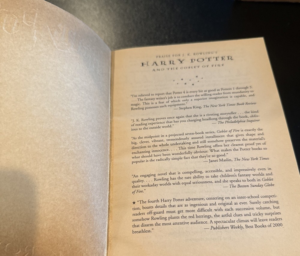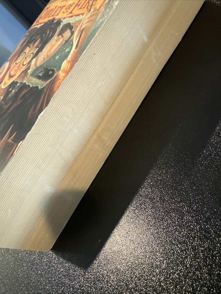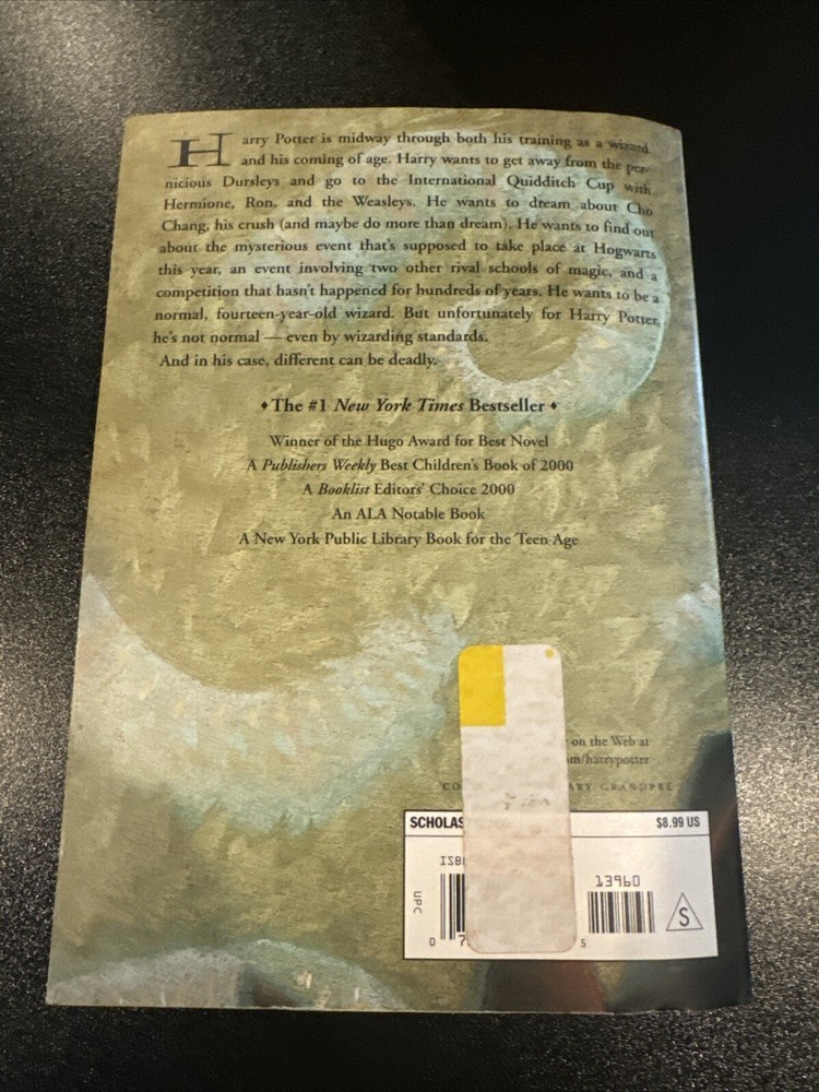 This is a vintage first edition paperback book titled "Harry Potter and the Goblet of Fire" by J.K. Rowling. It is part of the Harry Potter series, a fantasy fiction novel published by Scholastic in the 2000s. The book is in English and features large print, making it easier to read. Used condition with yellowing of pages, but no creasing on spine.