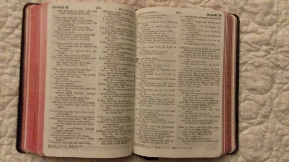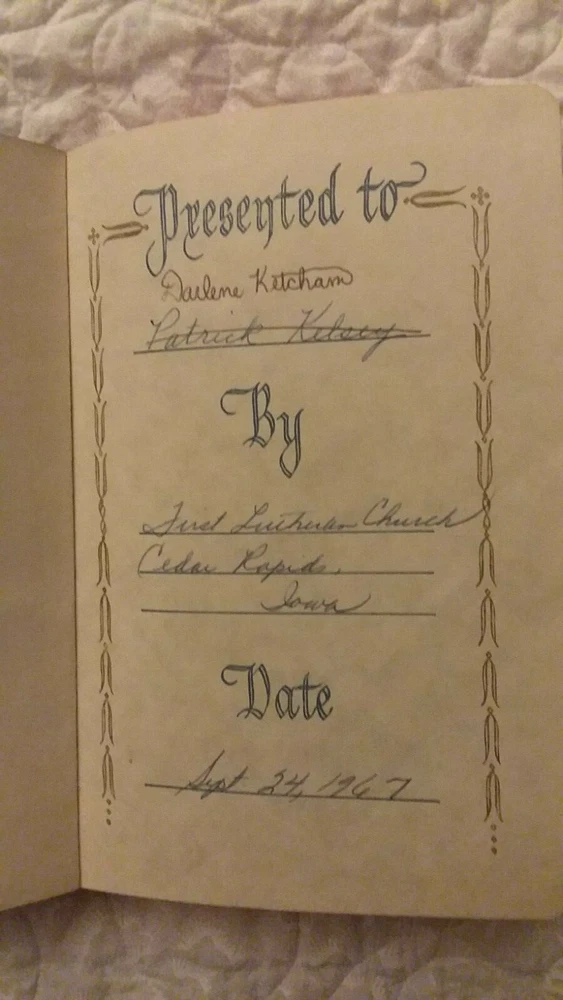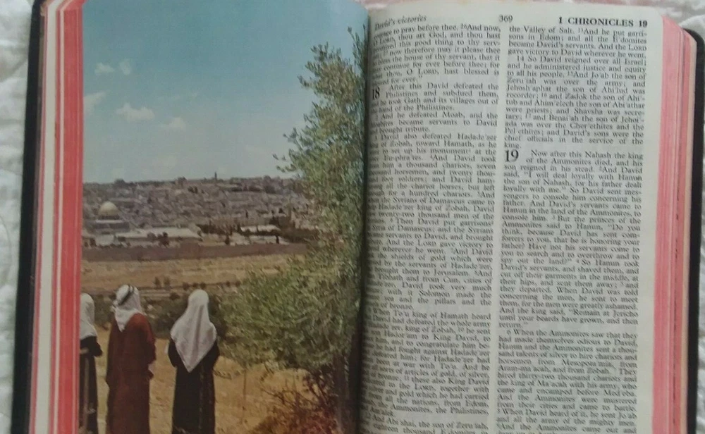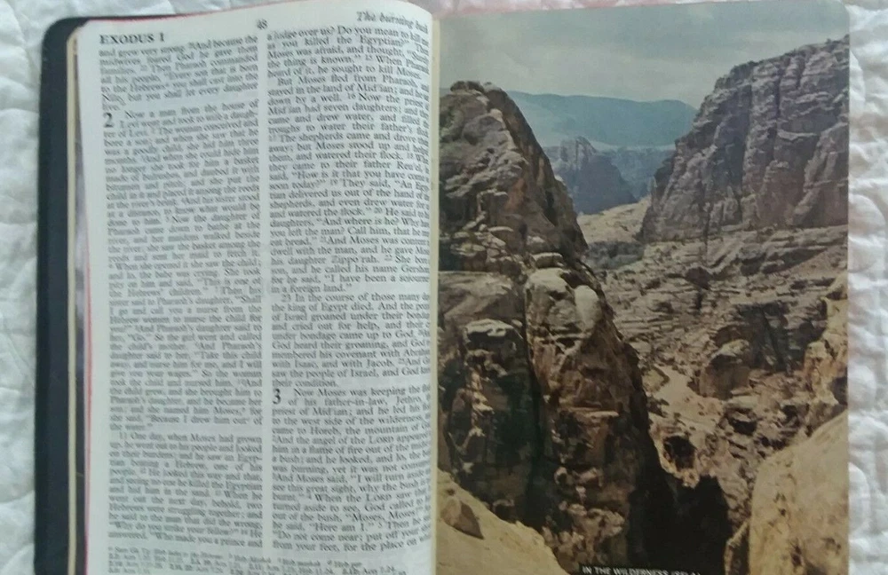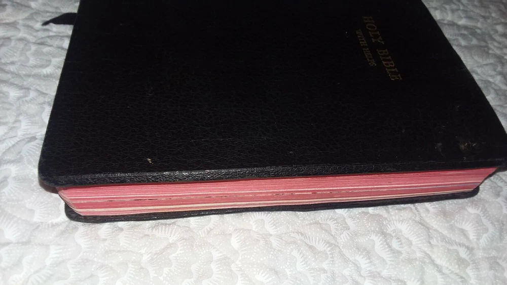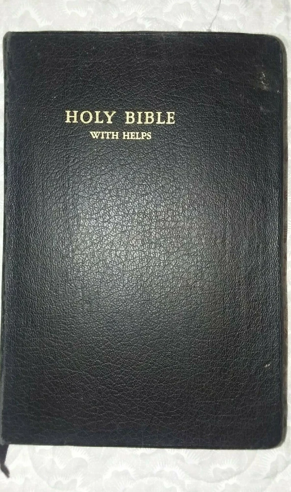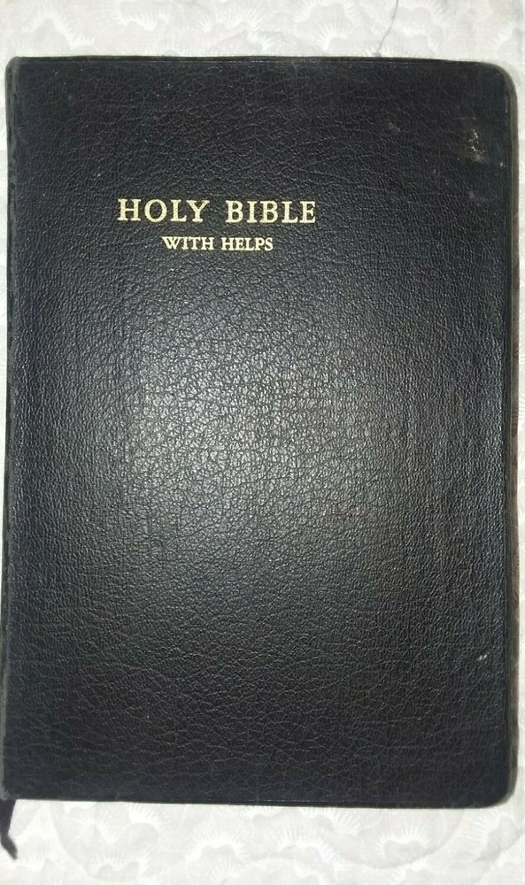 HOLY BIBLE With Helps-Revised std version-published 1952-Gift from 1967-Preowned Black leather, approx size 5 1/2 x 7 1/2 inches. Has an attached ribbon bookmark and n ice color photography of the Holy Land. Both Old & New Testaments. All pages in really nice condition. Binding in good condition. Back cover has a white streak on it that does not wash off. I tried a Mr. Clean sponge and a microfiber cloth with plain water. 'Presented to' page is inscribed with a name, a church, and the date September 24, 1967. Also contains maps. Board of Publication of the Lutheran Church in America, Philadelphia, PA. Ships USPS Media Mail to give you lower cost shipping.