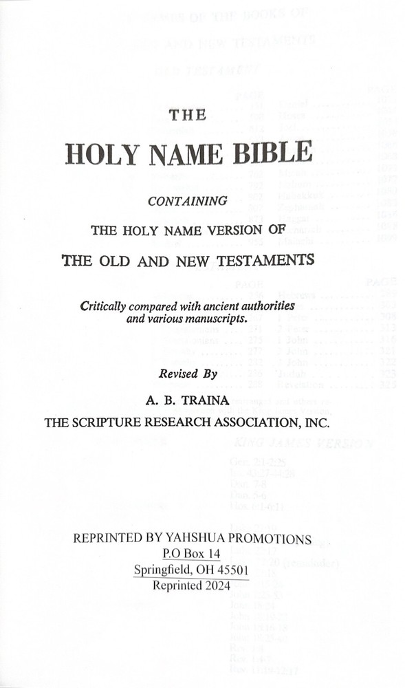 The Holy Name Bible was first published by Angelo B. Traina in 1963. This Bible is a reprint of the 1989 version. The Preface at the beginning of the Bible tells many of the reasons for placing the true original names back into the scriptures. The Holy Name Bible was the first English Bible to restore the True Original Names of Yahweh-Elohim-Yahshua back into the Bible. Yahweh is the English transliteration of the four Hebrew characters called the tetragrammaton. Lord is a false title that Bible translators substituted for Yahweh. Halleluyah means Praise Yahweh, not praise the Lord, and it is put back into the places it was taken out. Psalms 146 to 150 originally began and ended with Halleluyah, and it is inserted where it was originally written. Elohim is the original title for the creator, and is placed where the translators put the false title of God. There is no letter "J" in Hebrew, and the letter "J" is only 400 years old in the English alphabet. Therefore it was impossible for the savior born 2000 years ago to have the name of Jesus. The true name of the savior is Yahshua. Yahshua means Yahweh is Salvation. Yahshua is back into the many places that it was taken out. Messiah is also put back into the scriptures where the Bible translators falsely put the title, Christ. The version text is one of the closest to the King James Version as any other Sacred Name Bible. Exodus 3:14 has the phrase, "AYAH ASHER AYAH" , which means, I will be what I will to be. "El Shaddai" is back in the Bible, where it was taken out of the KJV. There are so many other wonderful features too numerous to mention. This version has a bigger size with larger print than previous versions of this Bible.