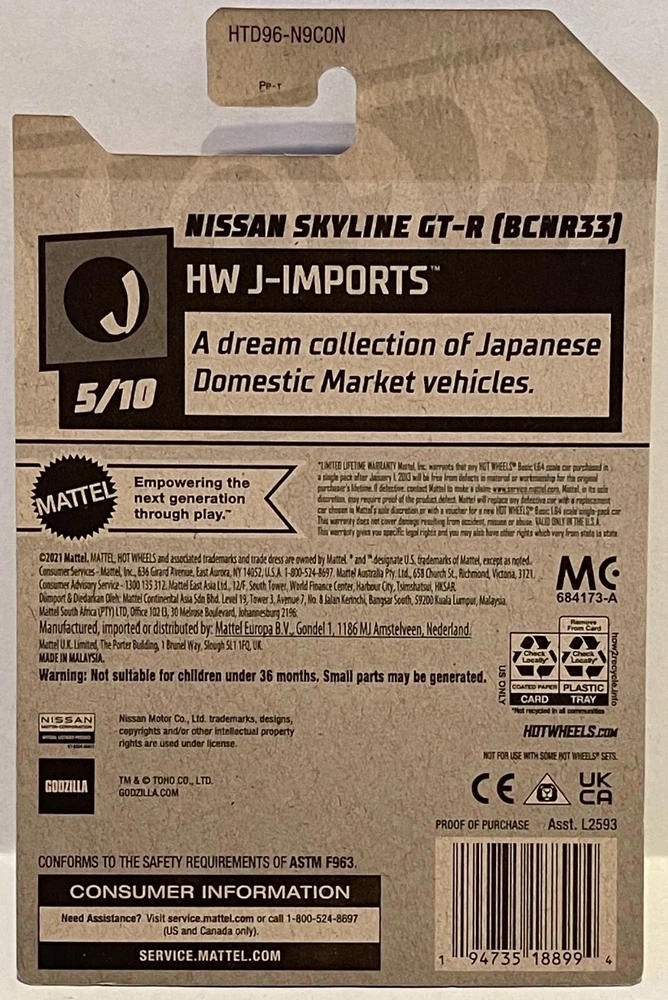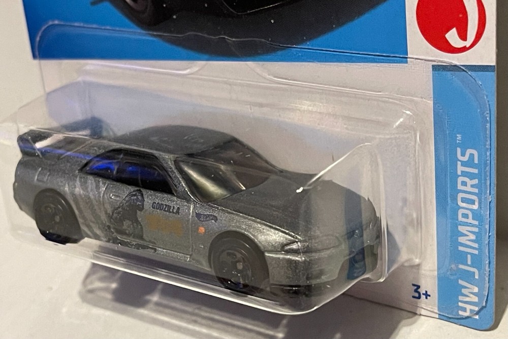 This Hot Wheels J-Imports Nissan Skyline GT-R BCNR33 is an absolute stunner! The sleek flat silver paint with bold Godzilla graphics gives it a premium look. The details are sharp, and the card is in fantastic condition—perfect for collectors. Shipping is super affordable, and the seller offers combined shipping to save you even more. A must-have for JDM fans and Hot Wheels enthusiasts alike! Don’t miss out on this gem!