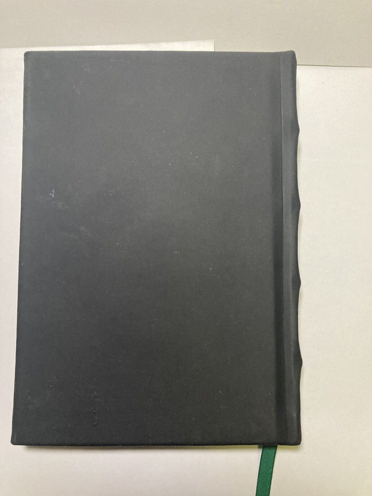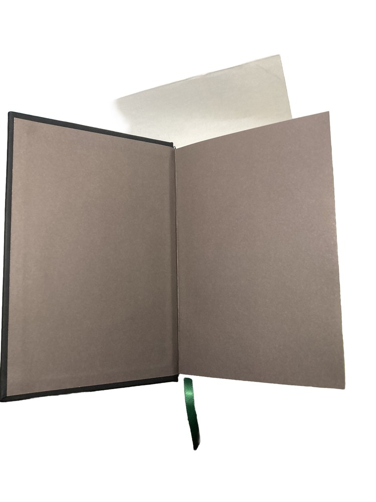 Non- ruled, blank, heavy cream paper in a leather bound hard back with serpentine spine and official SLYTHER crest, pressed in metal, adorned on front cover with permanently attached green ribbon page...
