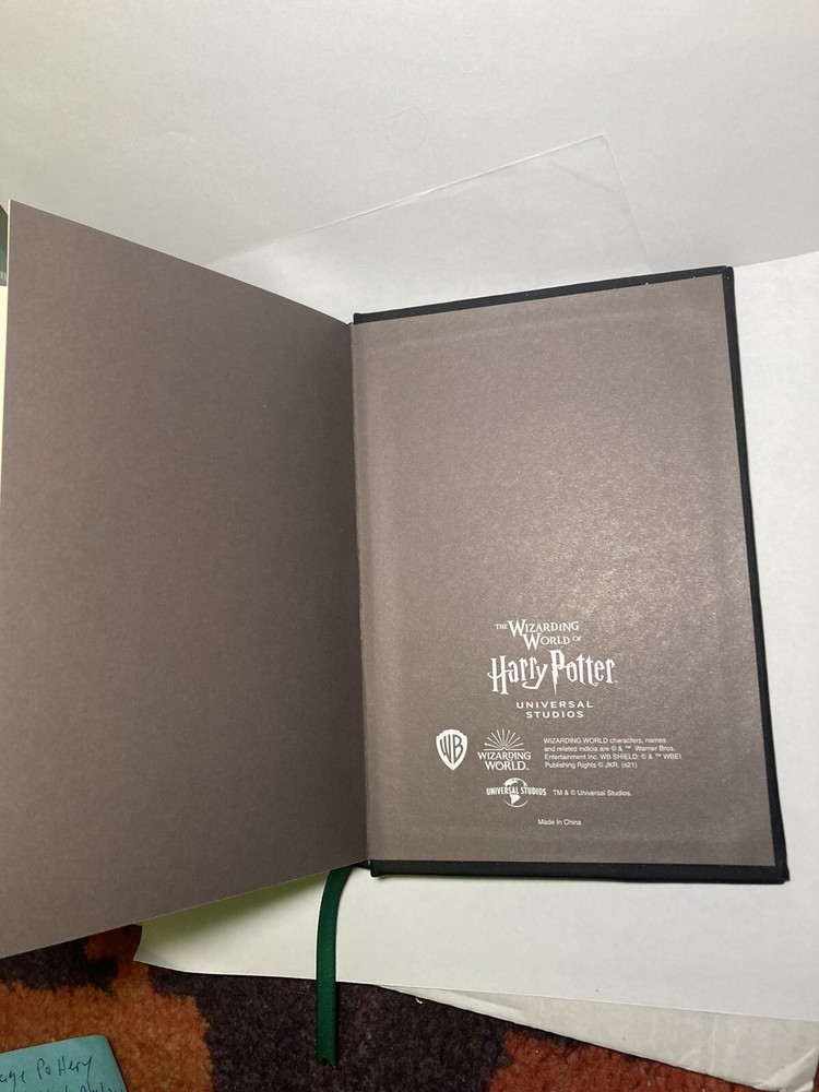 Non- ruled, blank, heavy cream paper in a leather bound hard back with serpentine spine and official SLYTHER crest, pressed in metal, adorned on front cover with permanently attached green ribbon page marker.