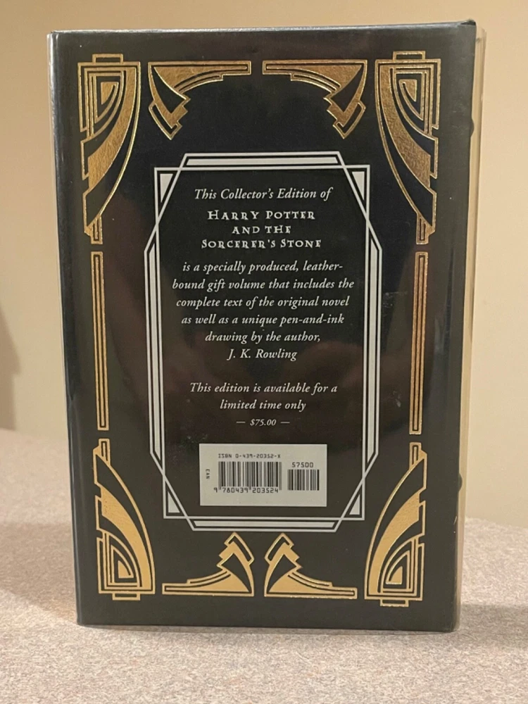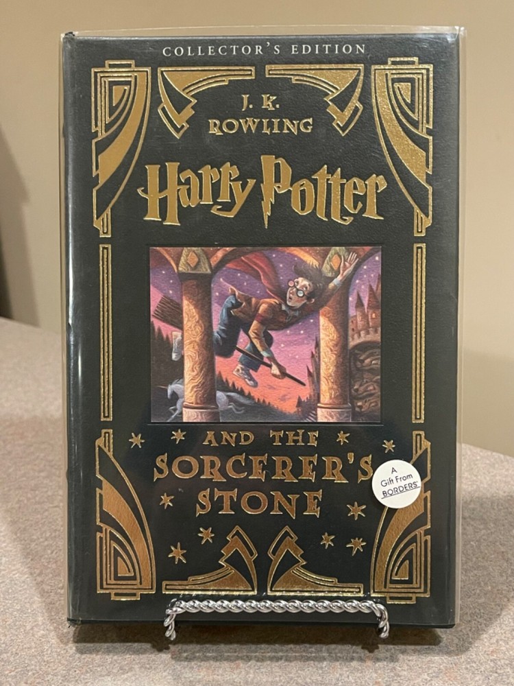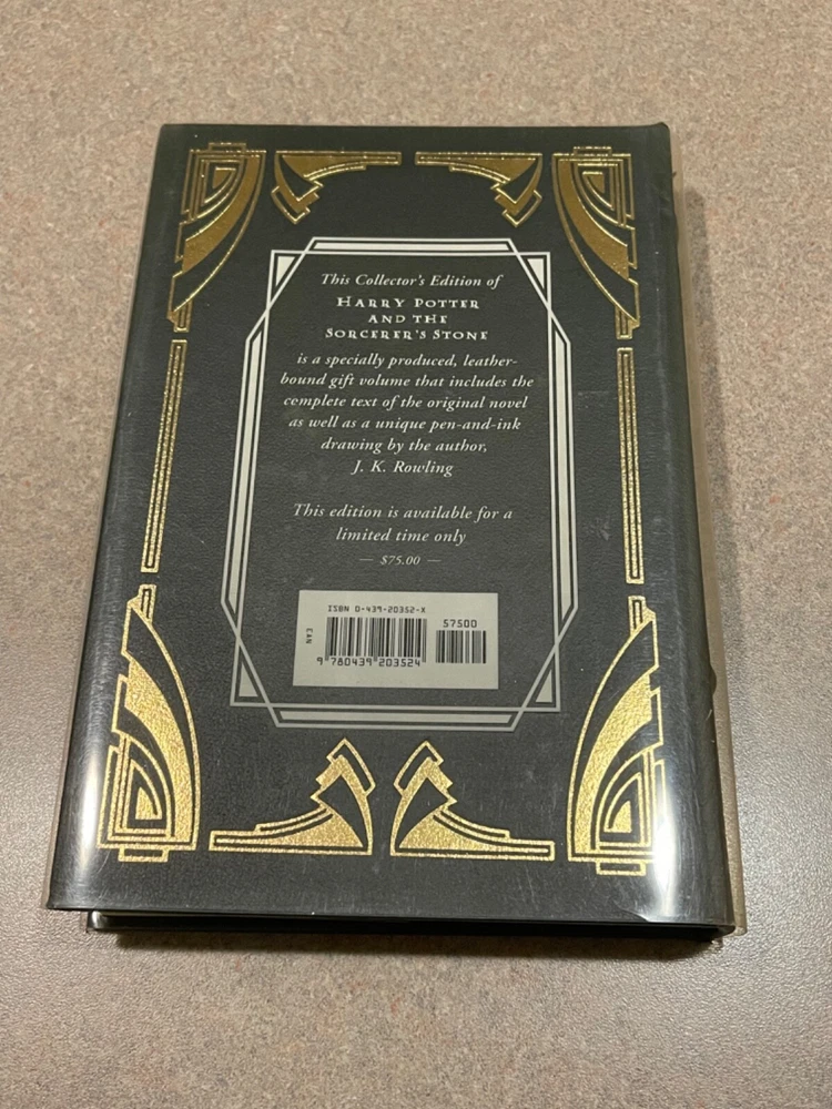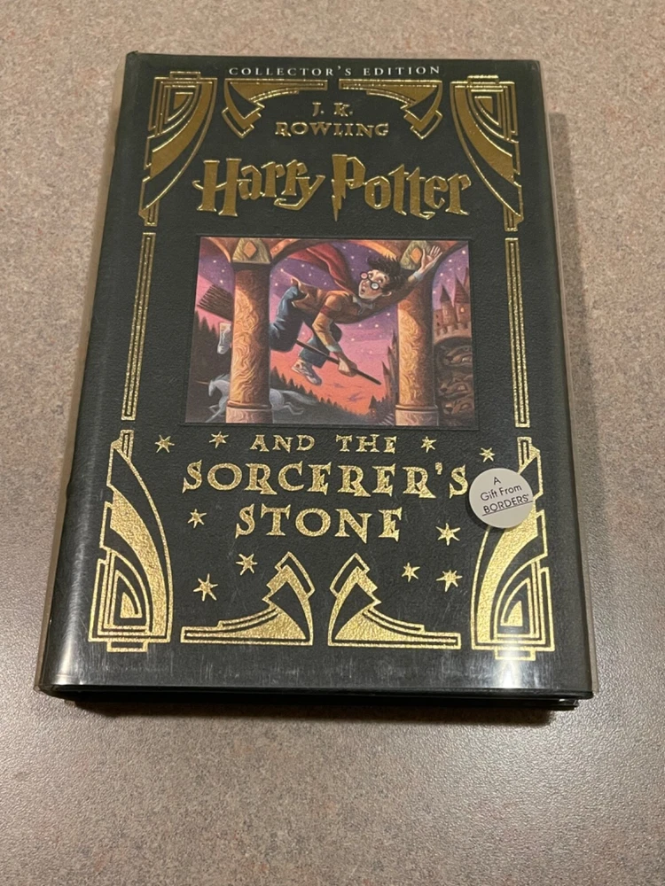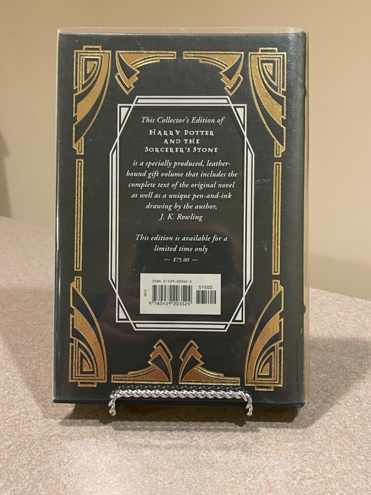 For sale is a rare, leather-bound copy of the Collector’s Edition of “Harry Potter and the Sorcerer’s Stone” by J.K. Rowling. This is a first printing of this deluxe collector’s edition. Includes a clear plastic dust jacket and gold-edged pages. The book appears unread, but a previous owner left an inscription on the page opposite the title page. Otherwise, this book is in fantastic condition.