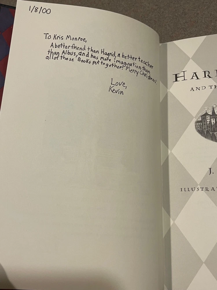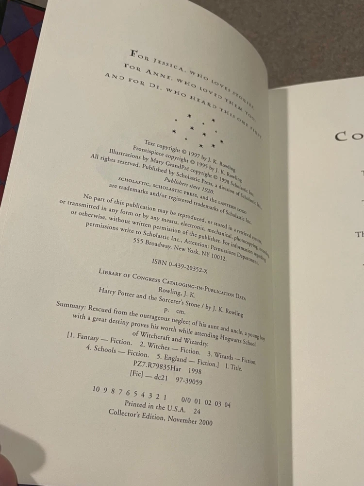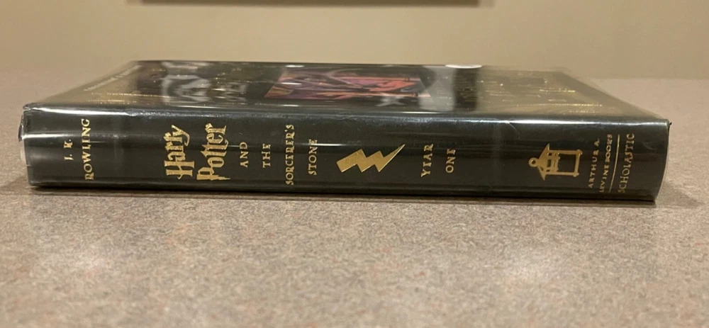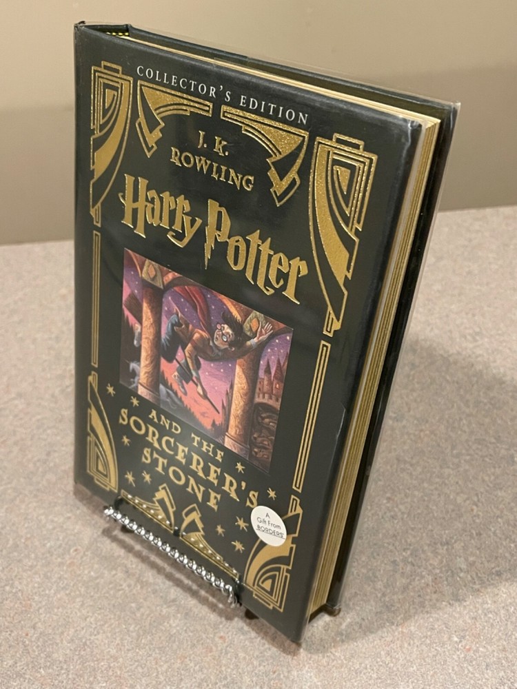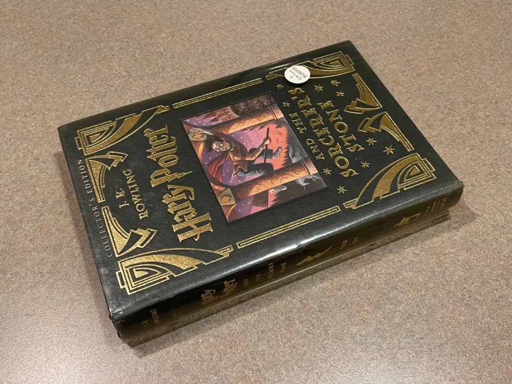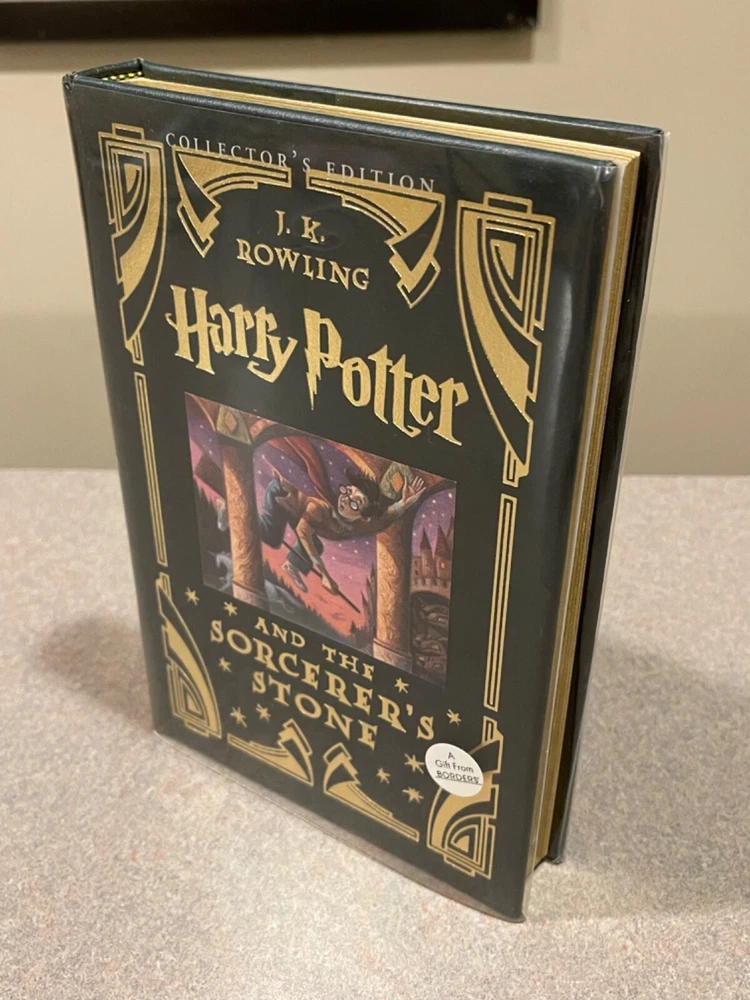 For sale is a rare, leather-bound copy of the Collector’s Edition of “Harry Potter and the Sorcerer’s Stone” by J.K. Rowling. This is a first printing of this deluxe collector’s edition. Includes a clear plastic dust jacket and gold-edged pages. The book appears unread, but a previous owner left an inscription on the page opposite the title page. Otherwise, this book is in fantastic condition.