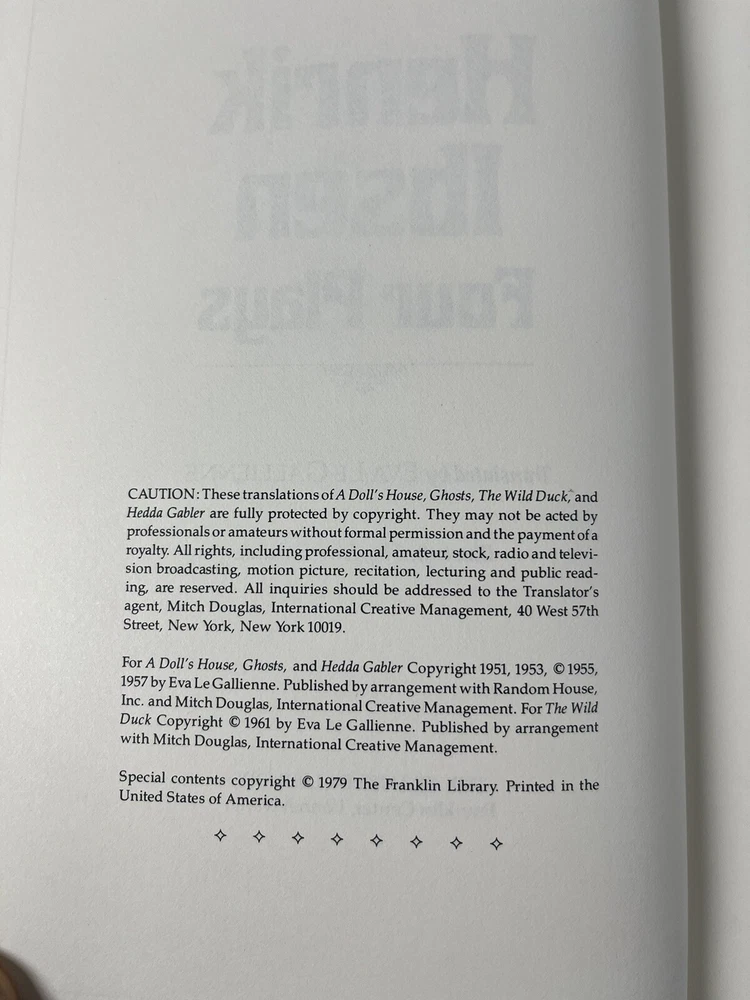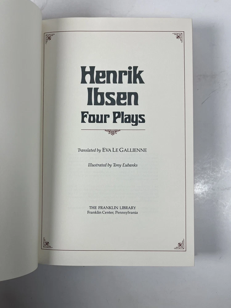 This Franklin Library edition of Henrik Ibsen's Four Plays is a must-have for any literature and fiction collector. With its leather binding and illustrations, it's a beautiful addition to your collection. Produced in the United States, this book is a classic topic that will surely captivate any reader. The publisher, Franklin Library, is known for its high-quality books and this one is no exception. It's a great find for anyone looking for an antiquarian and collectible book. Get your hands on this Henrik Ibsen Four Plays edition today and add it to your collection.