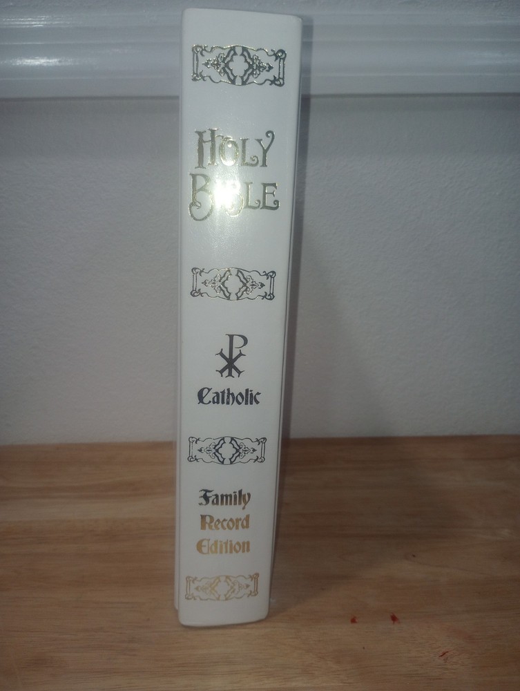 Like New in good condition This is a beautiful, white color with gold lettering Family Record Edition of the Holy Bible. The book is in excellent condition and provides a great addition to any collection. The publication year and author are unknown, but the book has a historical feel and is a must-have for anyone interested in religion and Bibles. The book is in English and includes features such as a family record section. The publisher is Fireside Catholic Bibles and the genre includes religion and Bibles. The book is classified under the categories of books and books & magazines. This is a new other and is a great gift for anyone interested in Christianity and general spirituality.