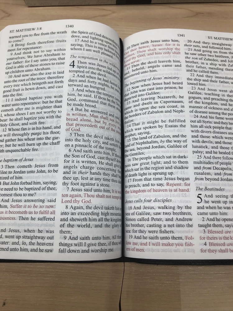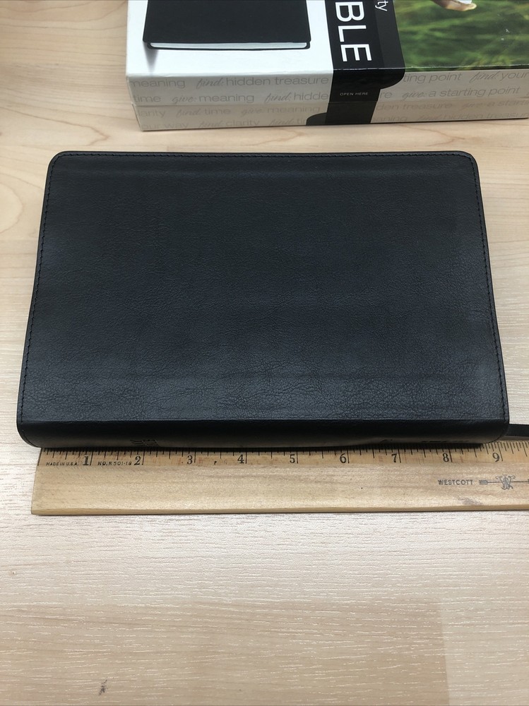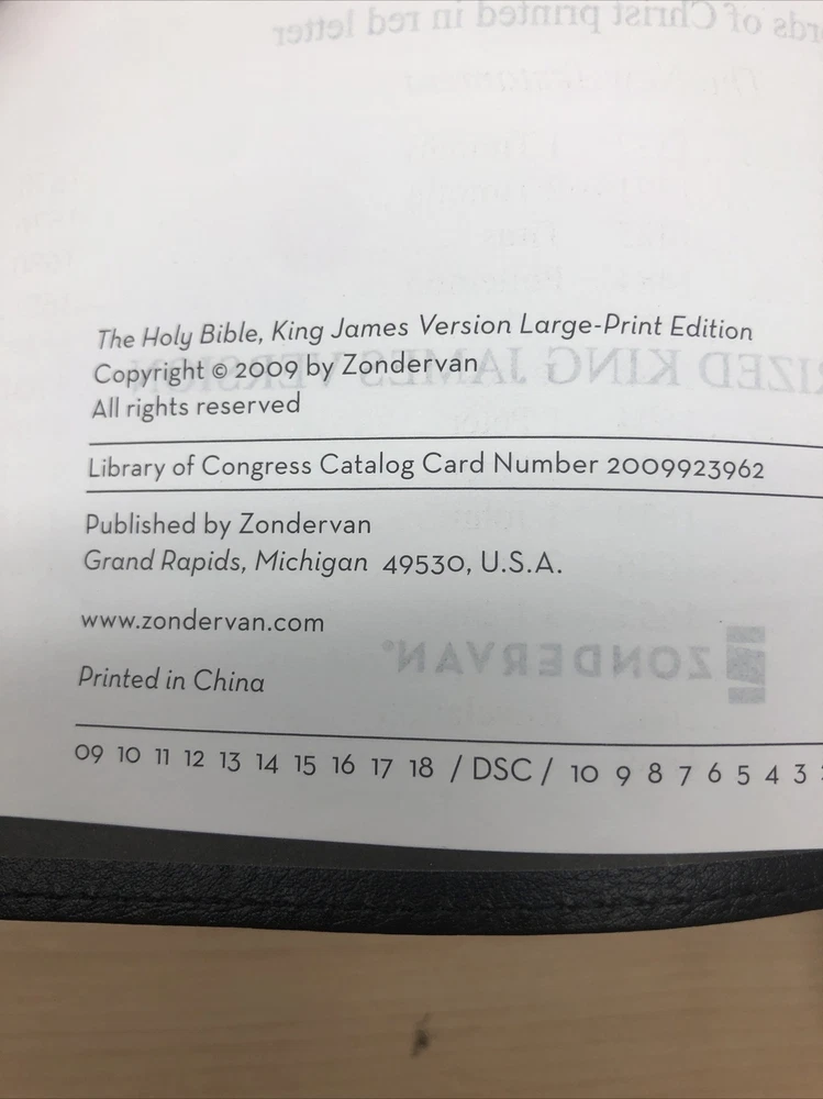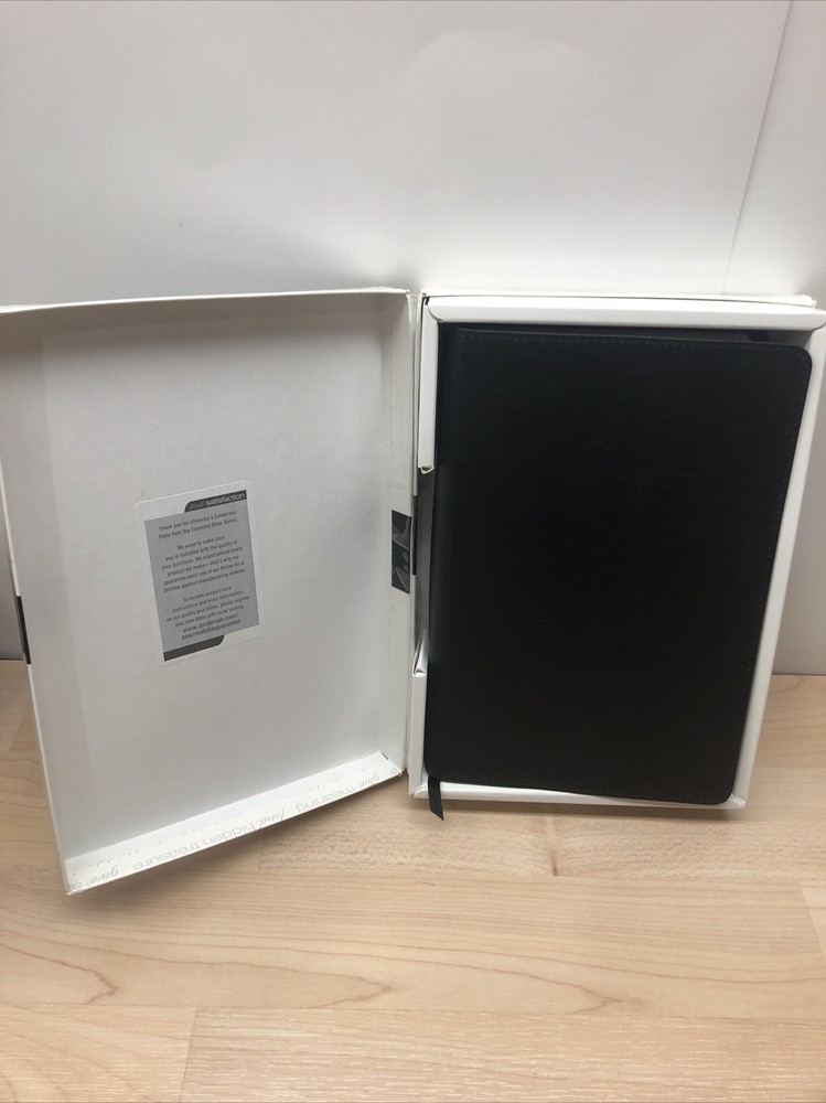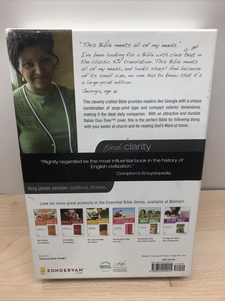 Box shows wear but the Bible Cover and it's pages are excellent. This is a highly sought-after edition of the Bible, published by Zondervan in 2009. The King James Version is beautifully presented in large print, making it easy to read for young adults, ages 9-12, and adults alike. The book is part of the Essential Bible Series and includes 1749 pages of scripture with Red Letter edition, making it a valuable addition to any collection. The book is in excellent condition and has been well-maintained. It is published in English and manufactured in China. The cover measures 8 3/4 inches in length and 5 3/4 inches in width, with numerous features such as a beautifully designed cover and Large Print text. This edition is perfect for anyone looking for a high-quality Bible to study or simply to add to their collection.