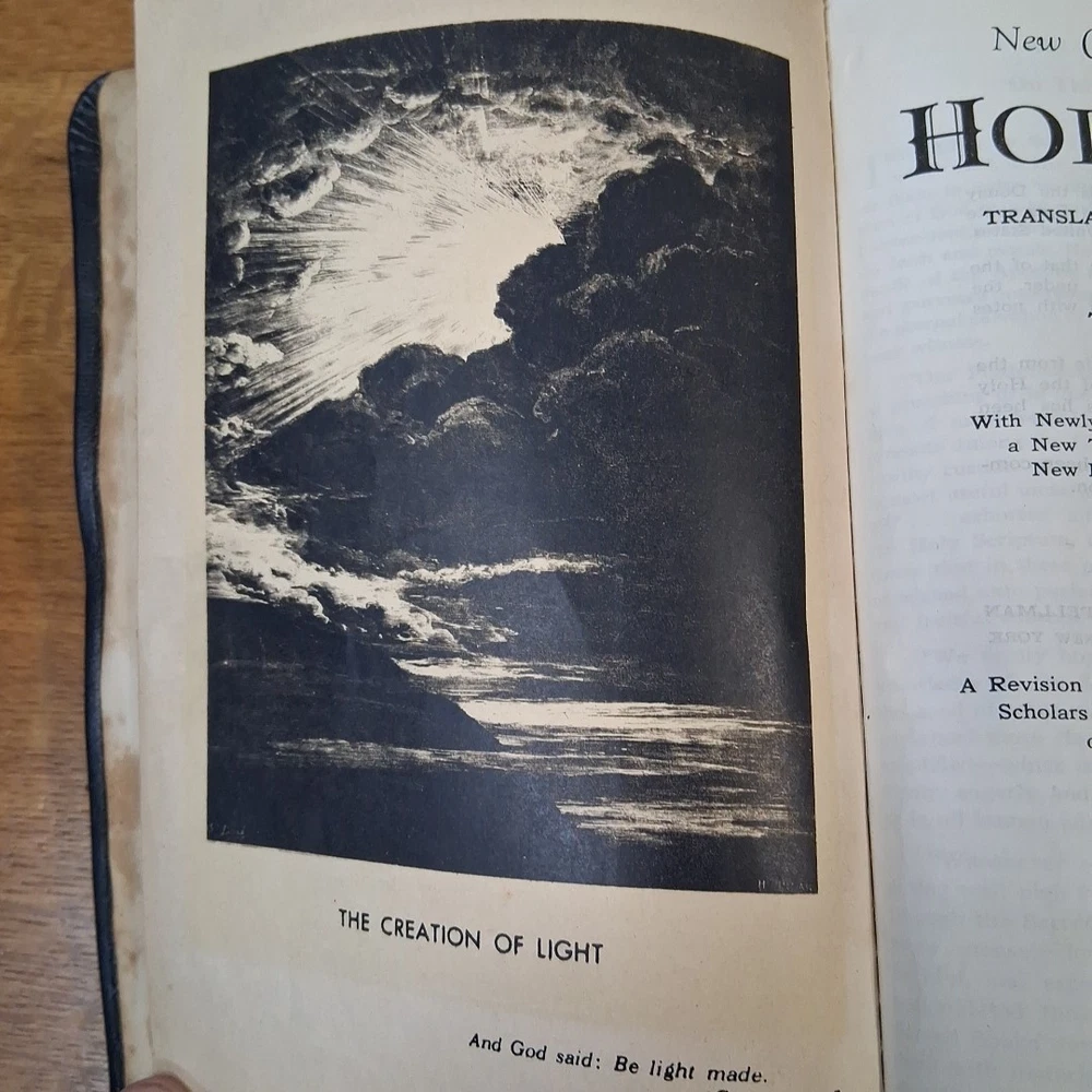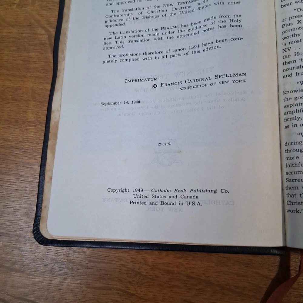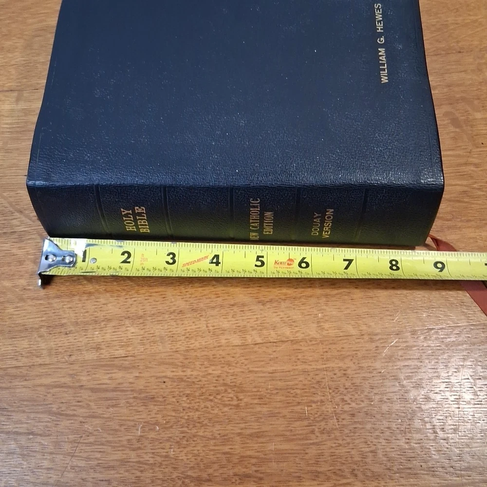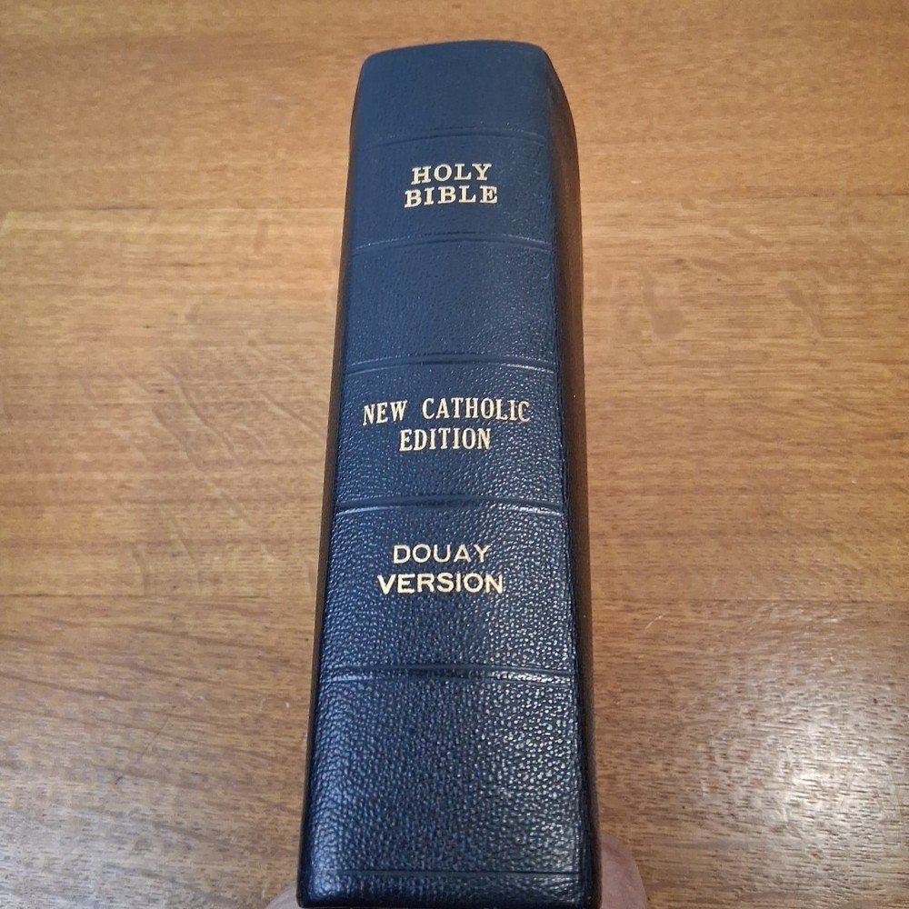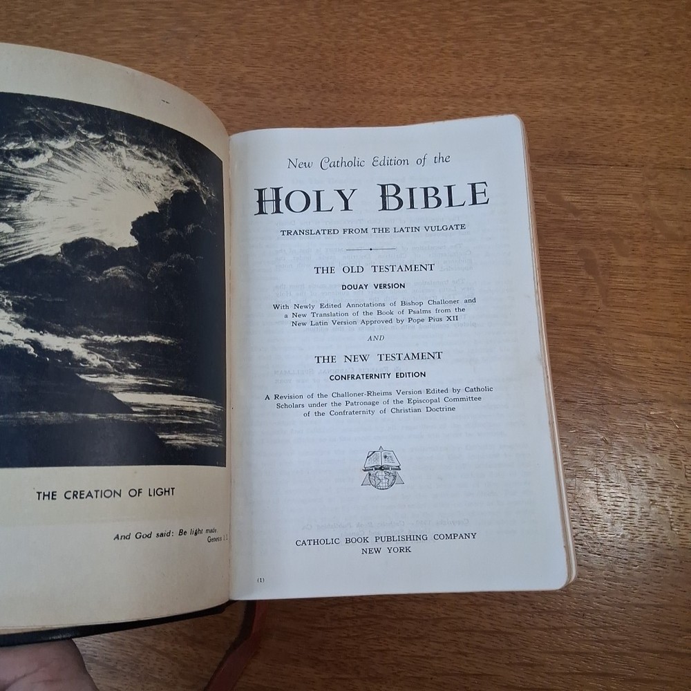 New Catholic Edition of the Holy Bible translated from the Latin Vulgate. The Old Testament Douay Version. The New Testament Confraternity Edition. 1949 Copyright, illustrated, owner's name on front cover. The cover is tight, and there are no loose pages. The pages are good, but with tanning on first and last pages. Writing/marks/highlighting found only on the Family Record pages between the Testaments. In very good condition with minimal shelf wear, bumped corners and the like. One spot on front cover damaged. Appears to have been used gently. See pictures. 8⅜ x 6 x 2" Weight is 2 lb 8 oz before packaging. Offers always considered. Thank you for shopping naven606. PG5cb.060525.34.9