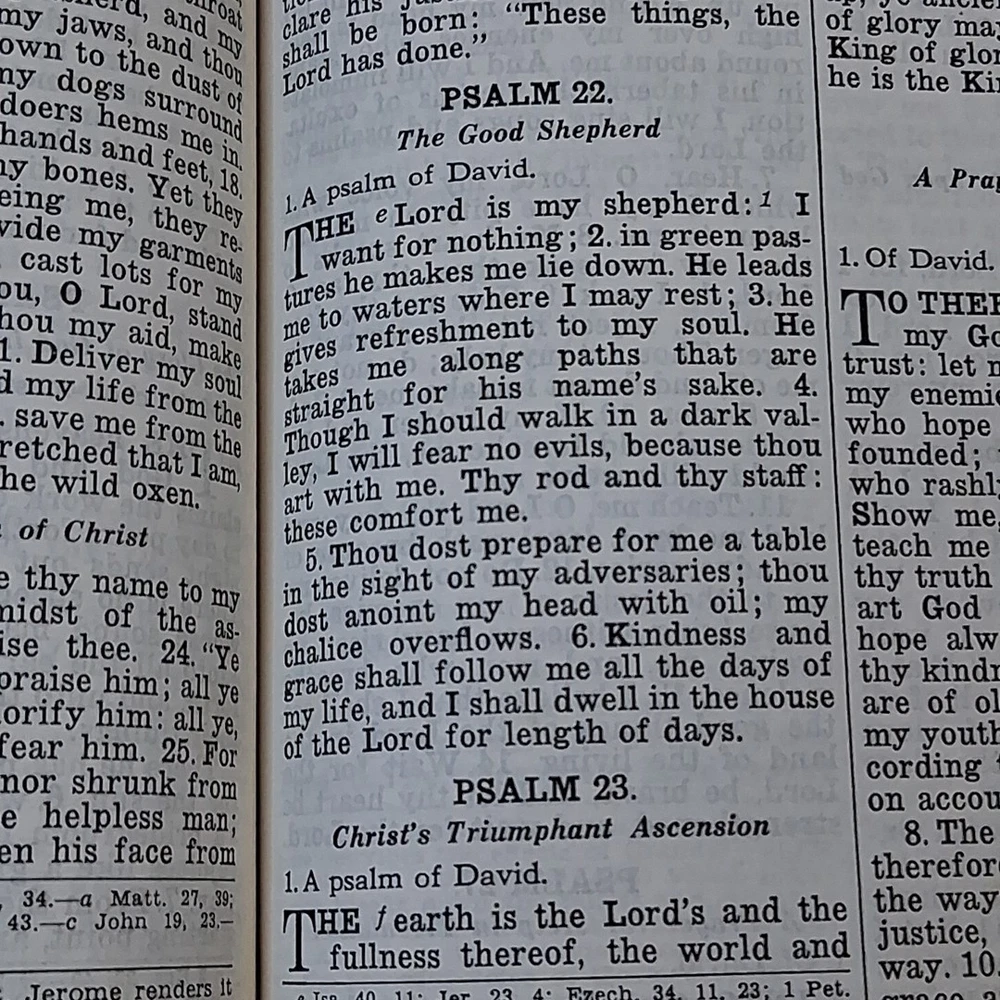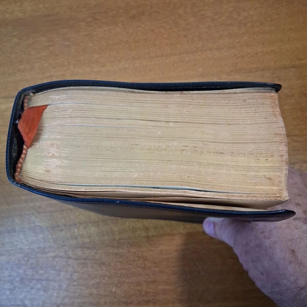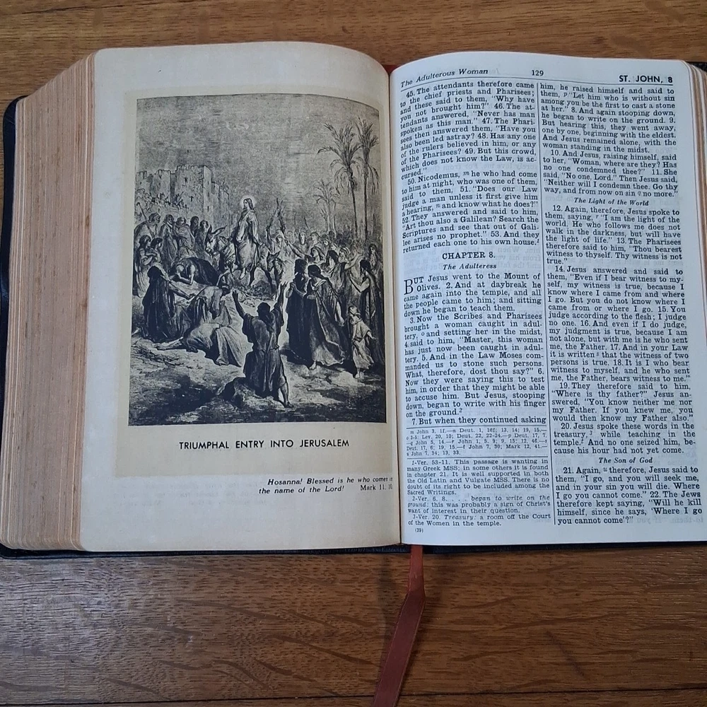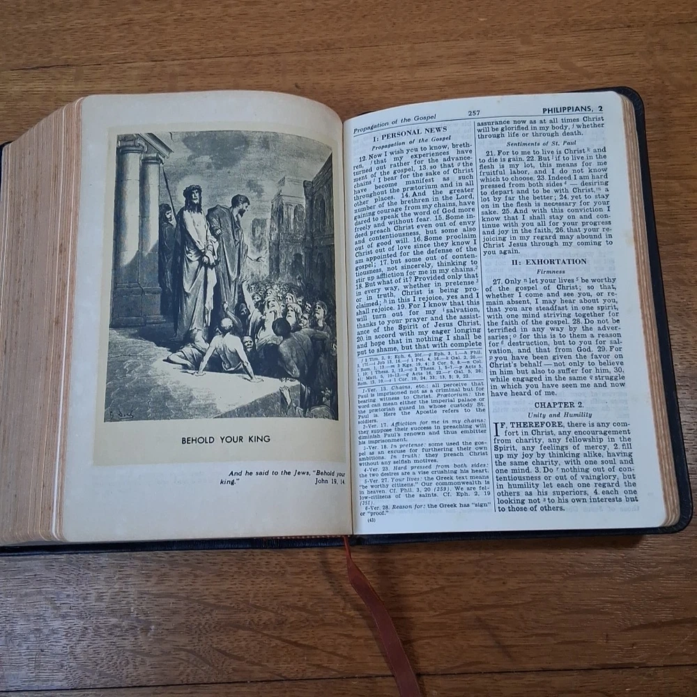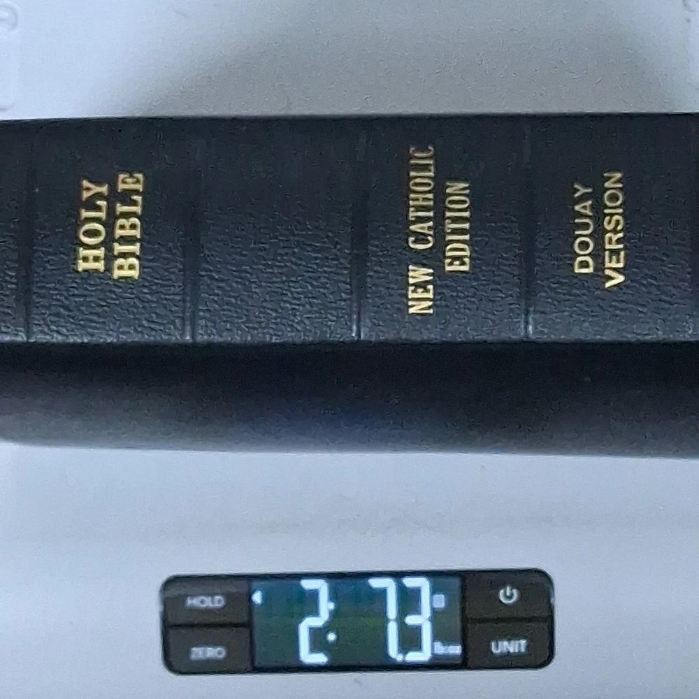 New Catholic Edition of the Holy Bible translated from the Latin Vulgate. The Old Testament Douay Version. The New Testament Confraternity Edition. 1949 Copyright, illustrated, owner's name on front cover. The cover is tight, and there are no loose pages. The pages are good, but with tanning on first and last pages. Writing/marks/highlighting found only on the Family Record pages between the Testaments. In very good condition with minimal shelf wear, bumped corners and the like. One spot on front cover damaged. Appears to have been used gently. See pictures. 8⅜ x 6 x 2" Weight is 2 lb 8 oz before packaging. Offers always considered. Thank you for shopping naven606. PG5cb.060525.34.9