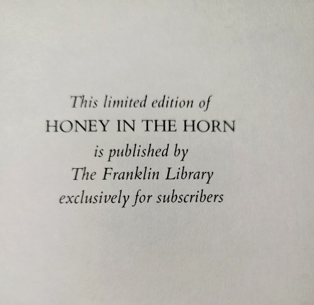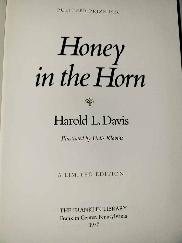 Honey in the Horn by Harold L Davis Franklin Library Pulitzer Prize Series, Limited Edition, 1977 Hardcover See pictures of the actual book for details The images included in this listing are not stock photos - these are hi-res scans/photos of the actual book(s) you will receive ! I have tried to describe any issues with the item and included scans/photos to give you the best description of the book. Please review the photos and if you have any questions or would like to see additional photos just let me know. US SHIPPING: Free Shipping for books via USPS Media Mail. INTERNATIONAL SHIPPING: I am happy to provide International shipping via Ebay’s Global Shipping Program HANDLING: All books are well packaged for protection during shipping so they arrive just as described in the listing. PAYMENT INFORMATION : Once you have selected all of the items you would like to purchase, please request an invoice so that I can combine the shipping charge. Please submit payment within 48 hours of purchase. CUSTOMER SERVICE: If you are dissatisfied with your purchase in any way, please don’t hesitate to contact me. If you receive the item and feel that it is not as described, just send me a message with the issue and I will do what I can to make it right. If there is a packaging or shipping issue, I humbly request that you take pictures if possible to help me improve my service. Please don't hesitate to contact me with any questions before, during or after your purchase. Thank you for your interest!