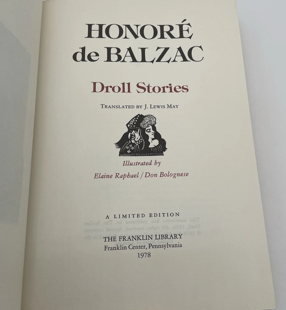 It’s in Beautiful condition! This Honore de Balzac book is a rare find for any literature enthusiast. The book is a collection of short stories, titled "Droll Stories", and was published by Franklin Library in 1978. The leather bound book is beautifully illustrated by Elaine Raphael and Don Bolognese, making it a work of art in itself. The book is written in English and has a Region of North America. The publisher is Franklin Library, and the book is categorized under Books & Magazines and Antiquarian & Collectible. The book is a must-have for any book collector or lover of classic literature. Shipped USPS Media Mail