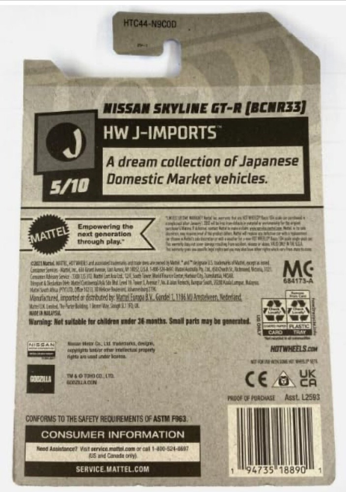 This Hot Wheels Godzilla Skyline is a fantastic find! The white paint and unique wing bend error make it stand out, and the protector keeps it safe. The details are sharp, and it’s a great piece for collectors or fans of JDM cars. Love the 1:64 scale—perfect for display or play. Highly recommend adding this to your collection!