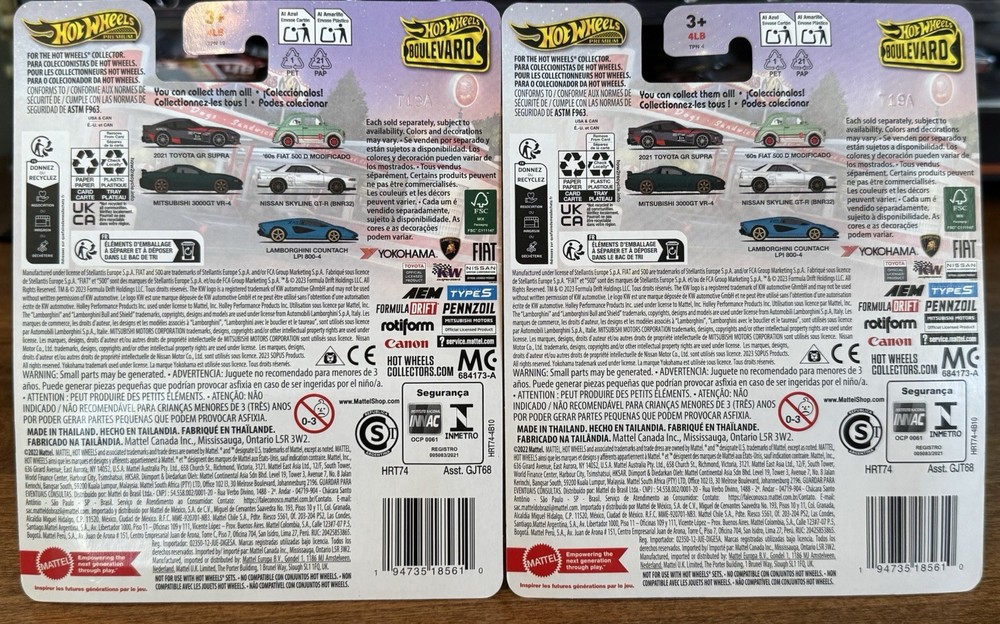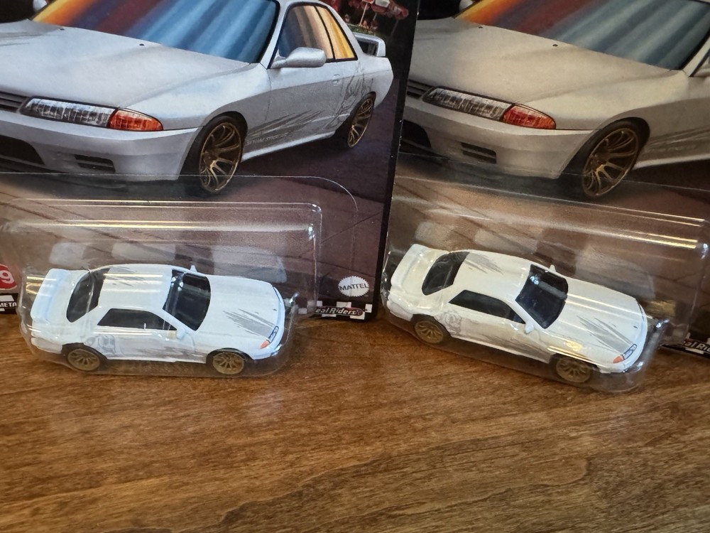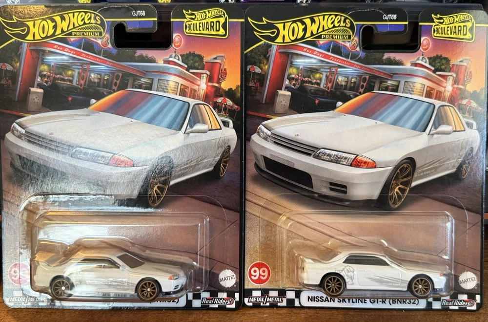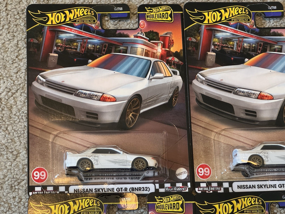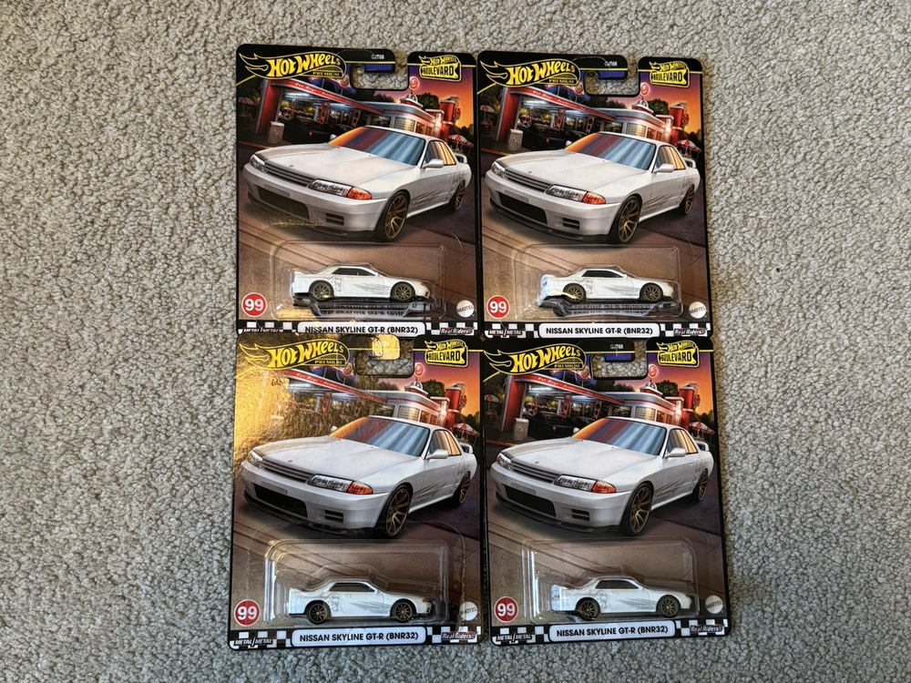 The product is a set of four Hot Wheels Boulevard #99 Nissan Skyline GT-R (BNR32) cars featuring the Godzilla theme. These diecast vehicles are 1:64 scale, white in color, and part of the Hot Wheels Premium series. Each car comes in an unopened package. Made by Hot Wheels in Thailand, these Nissan Skylines are recommended for children aged 3 and up, appealing to both boys and girls who are fans of the iconic car model. Cars pictured are what will ship. See pictures for more details.