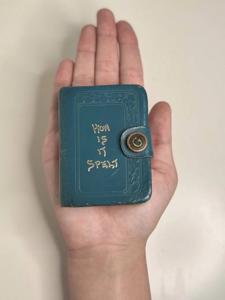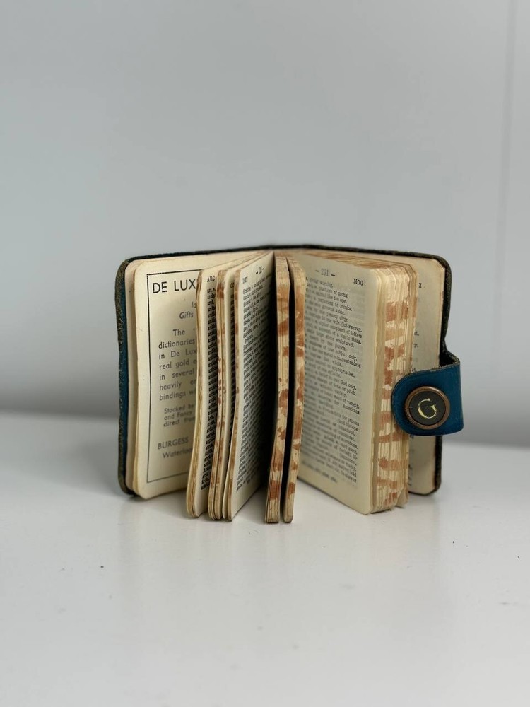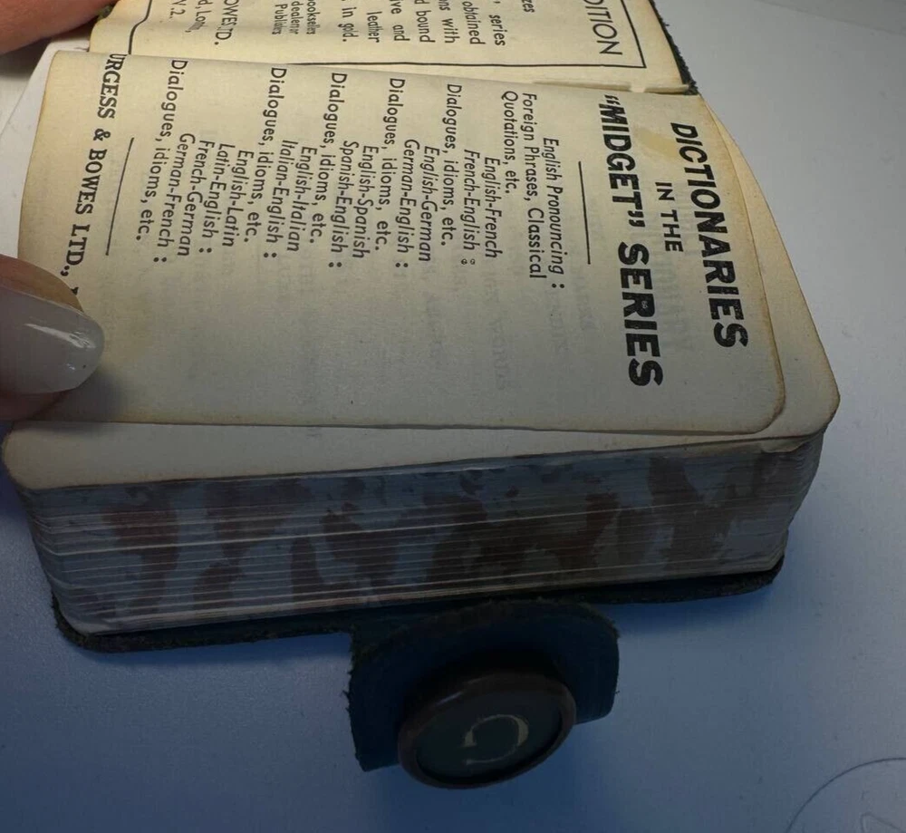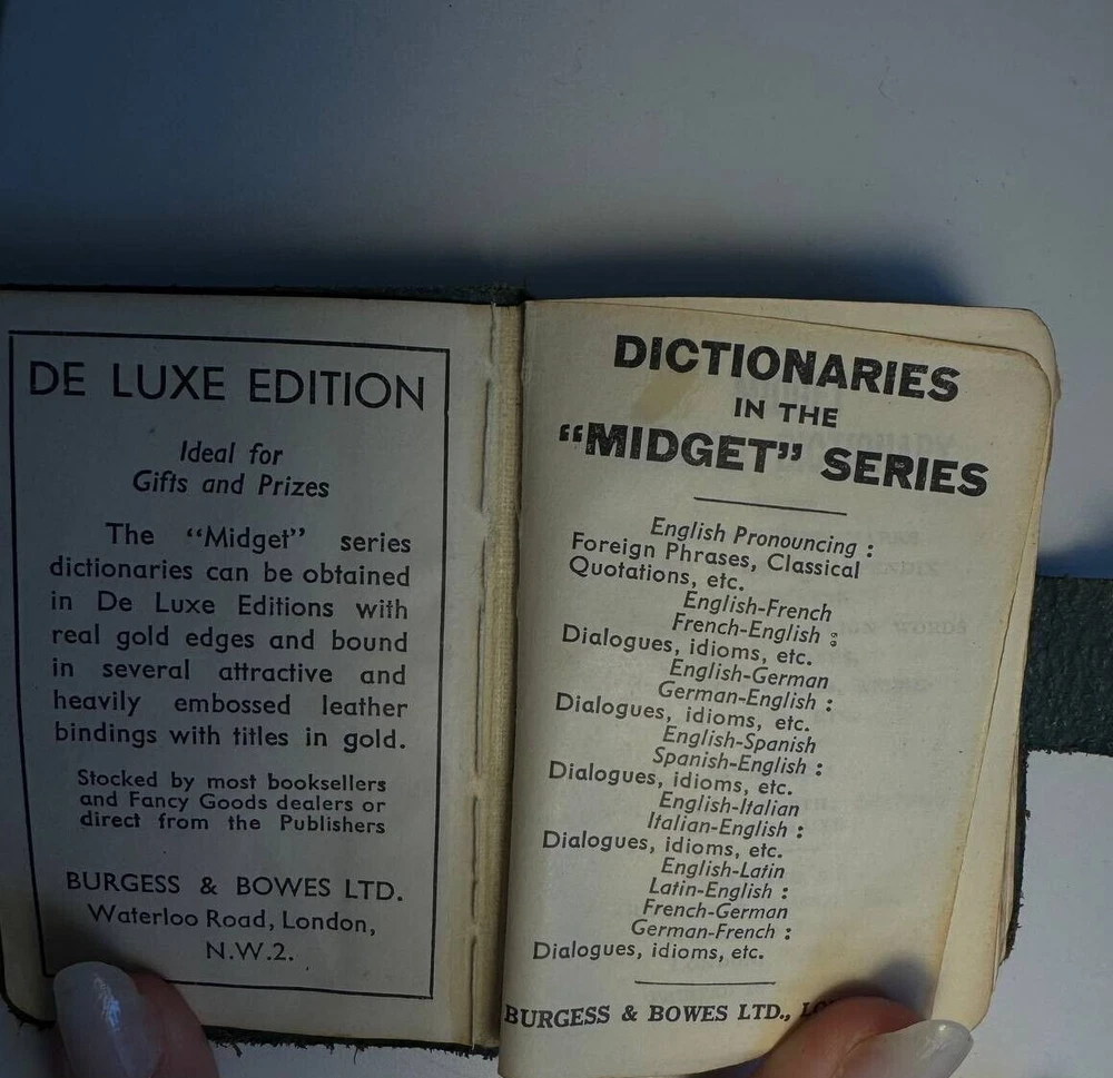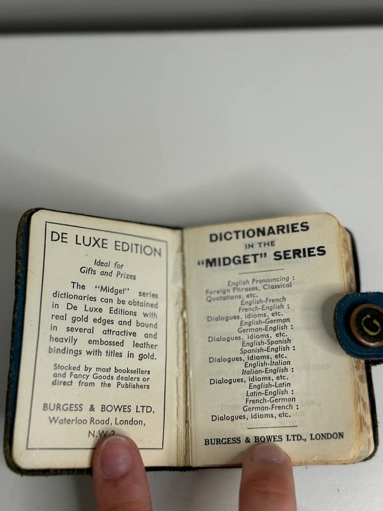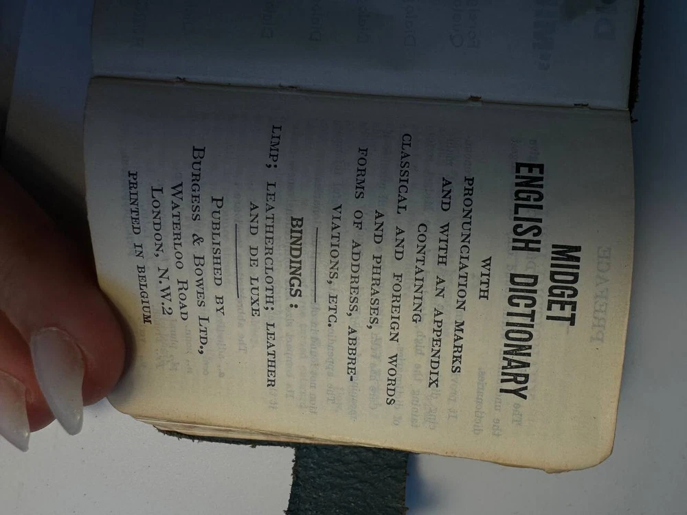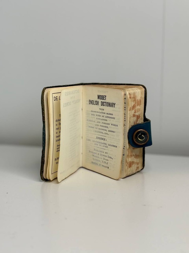 Midget English Dictionary, Burgess & Bowes Ltd, Undated but estimated 1950-1960's, 512ppThis leather bound English dictionary is very small and a real feat of antique vintage publishing.Despite measuring less than 3 1/4 inches by 2 1/2 inches this tiny leather bound volume still manages to hold five hundred and twelve pagez! With this being one of the nicest editions available of this 'Midget' dictionary, it is a rare find and a nice curio. In very good conditionSome wear to leather coversA little wear to pages inside with light signs of use, two inscriptions and some light general wear. a turquoise book, has a slightly darker shade than in the photo