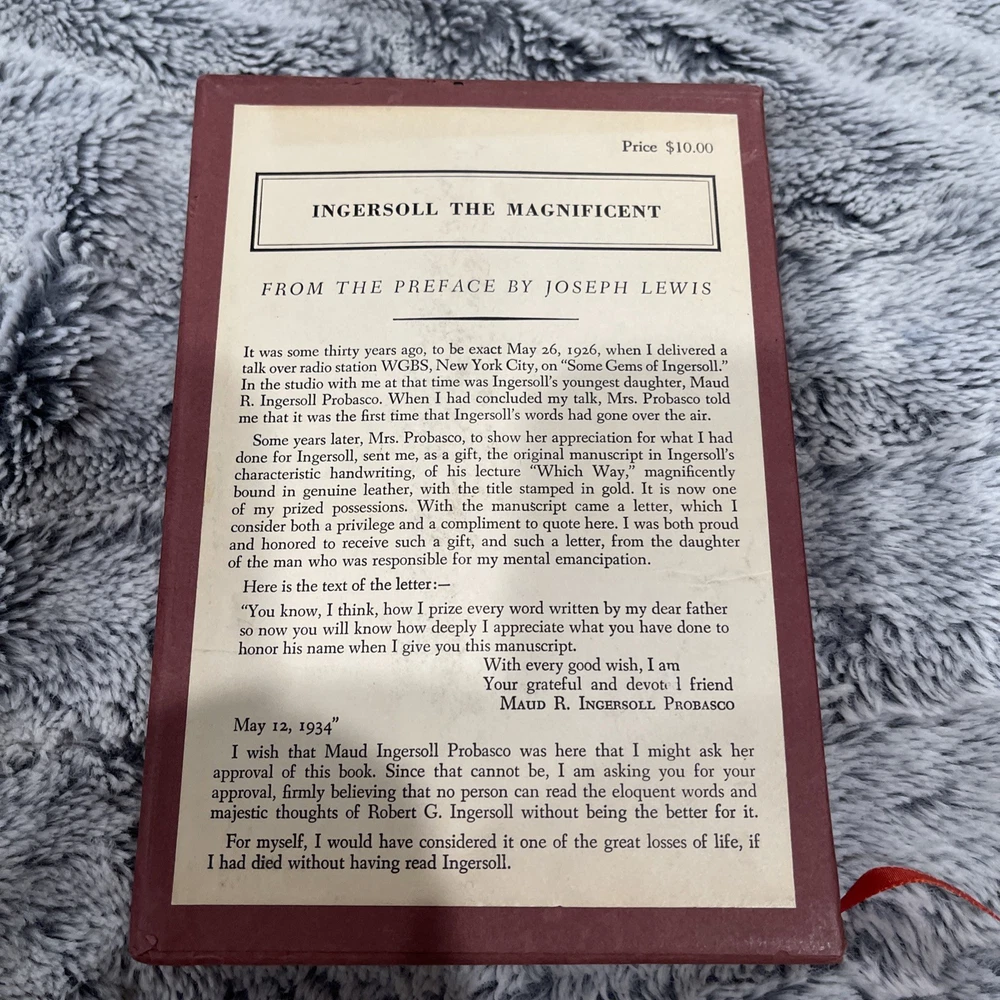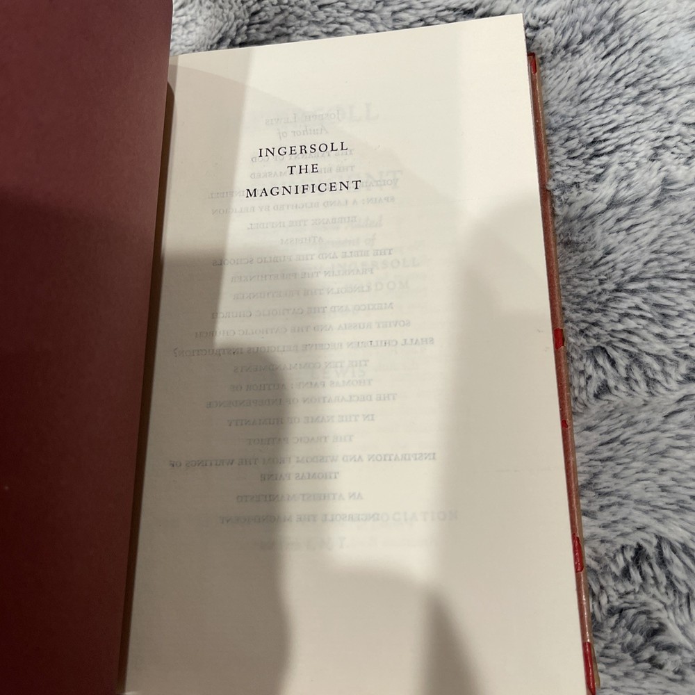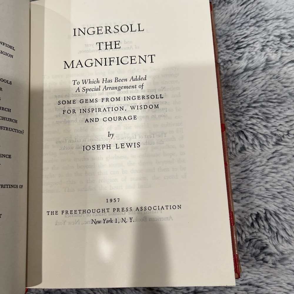 This is a first edition hardcover book titled "INGERSOLL THE MAGNIFICENT" written by Joseph Lewis and published in 1957. The book is leather bound and contains philosophical teachings on radio topics. It is a novel that falls under the philosophy genre and is written in English.