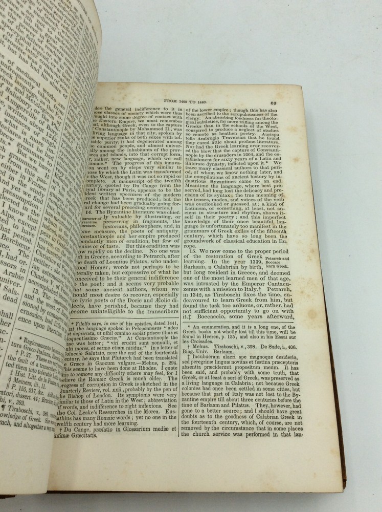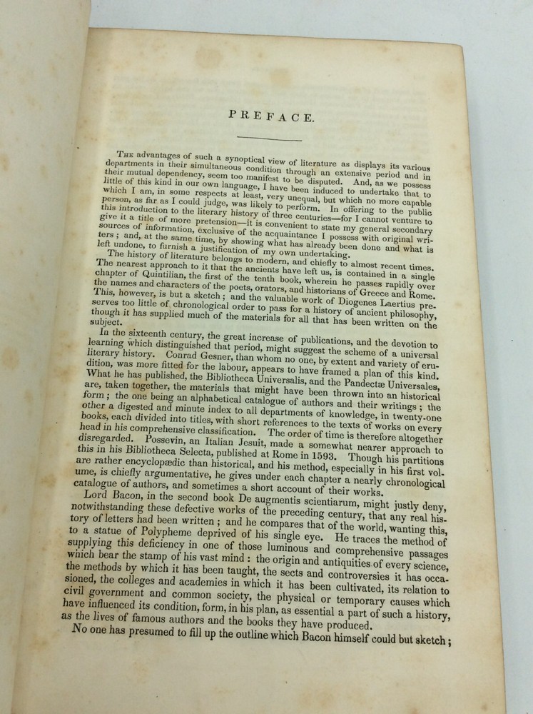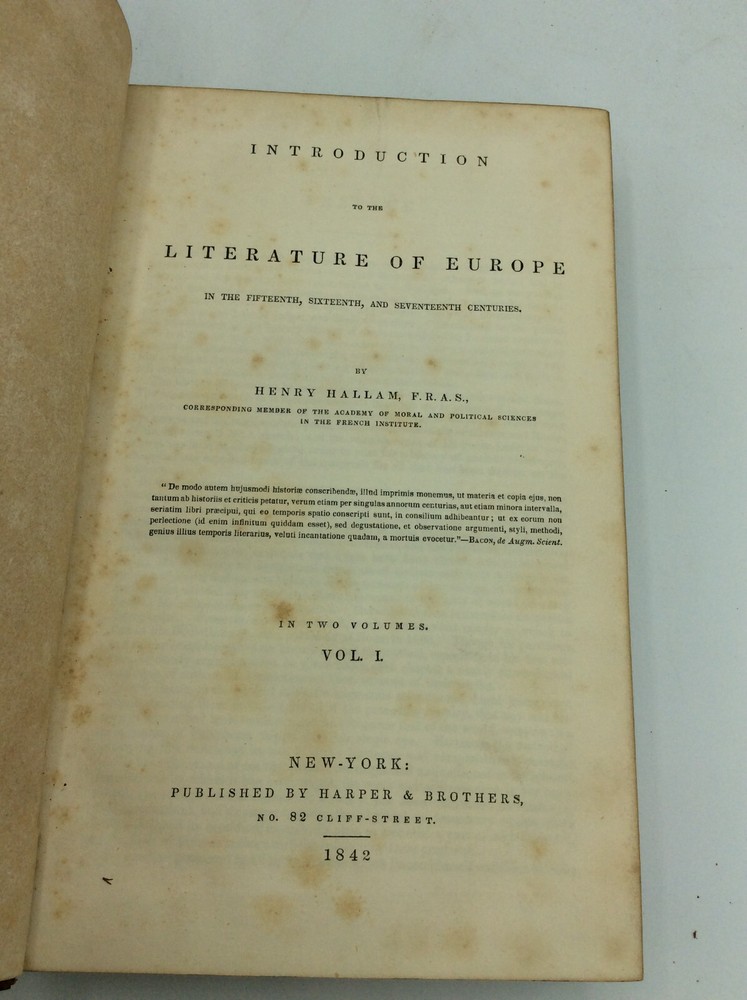 Henry Hallam INTRODUCTION TO THE LITERATURE OF EUROPE: 2 Volumes NY: Harper & Brothers, 1842. Leather bound. Vol I: 416p. Vol II: 462p. Bound in full leather. Two hardcover books in good condition. Leather shelfworn. Light scattered foxing else unmarked and tight. Item #131009