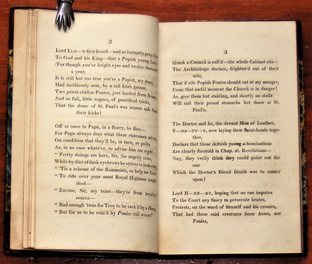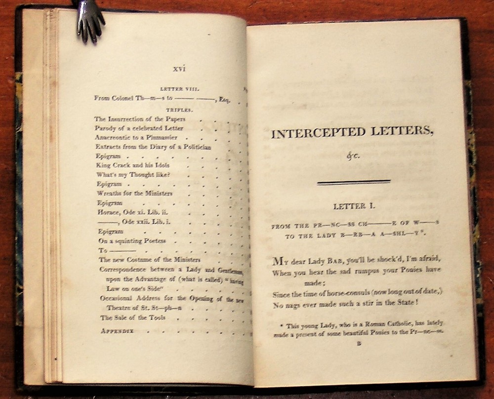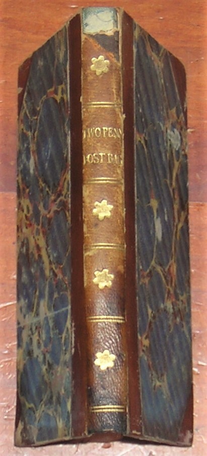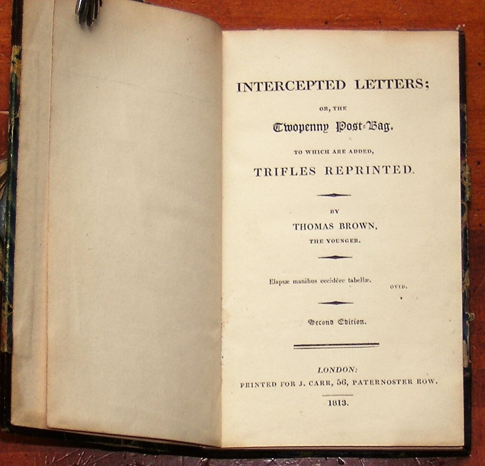 Intercepted Letters; or, the Twopenny Post-Bag, to which is added Trifles Reprinted , by Thomas Brown. Published in 1813 by J. Carr, London. Small (4 X 6 in.) hardcover in 3/4 leather and marbled paper boards, 111 pages. A collection of humorous verse. NOT a library discard. Acceptable condition. Unmarked and securely bound. There's a 3/4 in. chip in the spine head and a 1+ in. split running down the front spine edge, as well as a few rub-throughs along the board edges. A small piece of the marbled paper cover is missing by the bottom corner of the back board. Free shipping in the USA. Thanks for looking! Location: glass shelves, top shelf.