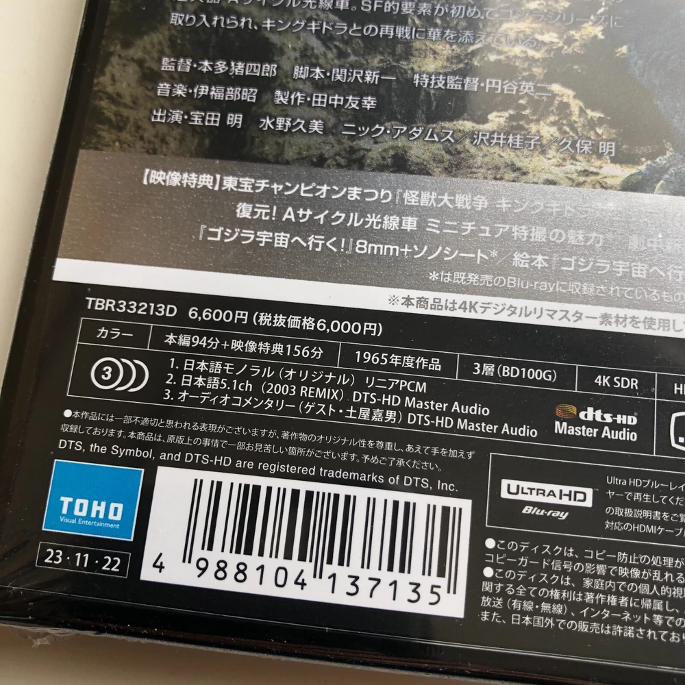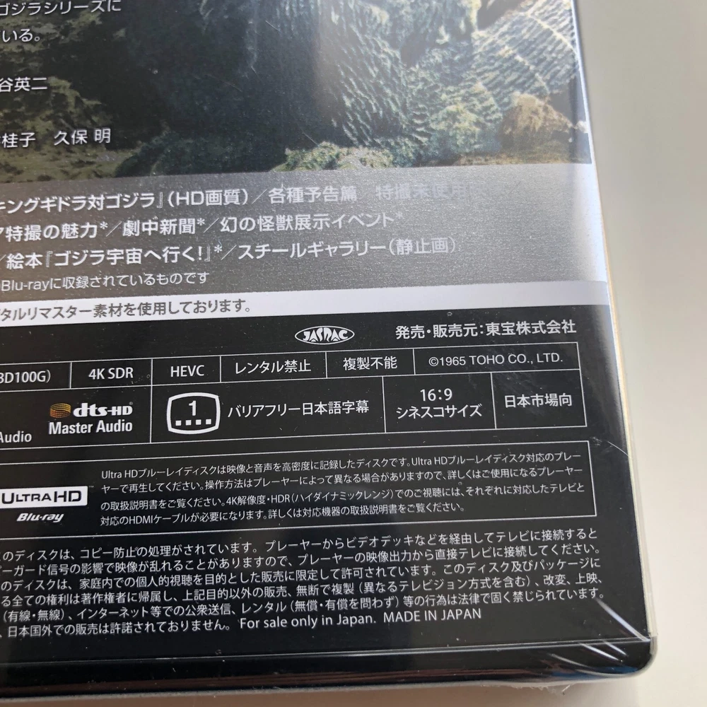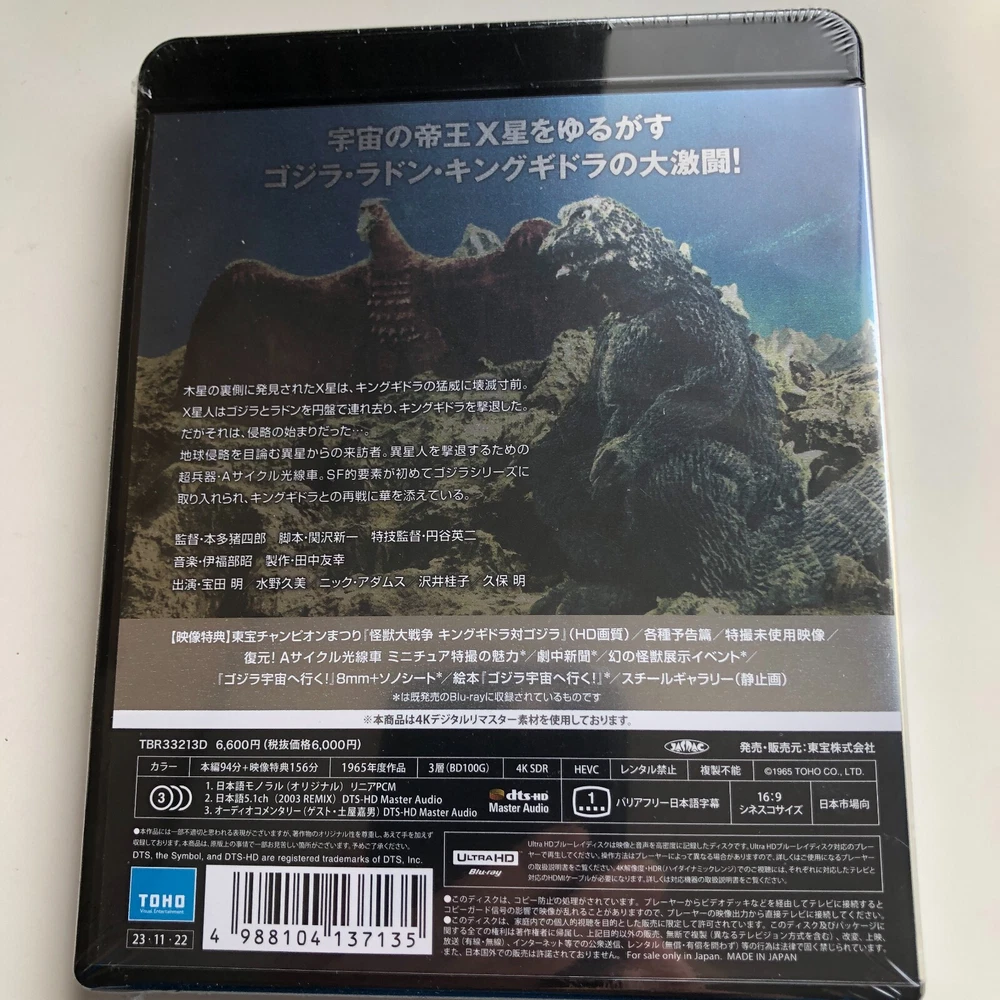 100% Authentic official product from Japan Title: Invasion of Astro-Monster (Kaiju Dai Senso) 4K Remastered Format: 4K Ultra HD Blu-ray (Region: free) Number of Discs: 1 Director: Ishiro Honda Writers: Ishiro Honda, Takeshi Kimura Starring: Akira Kubo, Yoshio Tsuchiya, Kyôko Ai, Yukiko Kobayashi, Jun Tazaki, Kenji Sahara Producer: Tomoyuki Tanaka Color: Color Running Time: 94 Minutes Original Release Year:1965 Aspect Ratio(s) Cinemascope Subtitles: Japanese Subtitles for the Hearing Impaired Audio Track: Japanese 5.1ch Surround, Japanese Linear PCM Monaural [STORY] Discovered on the far side of Jupiter, the Planet X is on the verge of destruction by the fury of King Ghidorah, and the Xilien take Godzilla and Radon away in their saucers to fight off King Ghidorah. But that was only the beginning of the invasion... Bonus Video - Champion Festival "Invasion of Astro-Monster Godzilla VS King Ghidorah" (HD quality) - Trailers - Unused special effects footage - Still Gallery - Restoration! A-cycle ray car - the fascination of miniature special effects * - Newspaper in a play - Monster exhibition event * - 8mm + flexi disc “Godzilla Uchu e Iku” * - Picture book “Godzilla Uchu e Iku” * * is from the previously released Blu-ray Audio Commentary (Guest: Yoshio Tsuchida) *Ultra HD Blu-ray player is necessary to play this Ultra HD Blu-ray disc. Please note that it will not play on regular Blu-ray player. For optimal viewing experience of 4K UltraHD content, 4K/HDR TV is recommended, although it is also compatible with 4K TV and HV TV. [About 4K UltraHD] 4K UHD boasts high resolution of 3840 pixels x 2160 lines (8.3 megapixels, aspect ratio 16:9), which is twice the horizontal and vertical resolution compared to the 1080p HDTV format, with four times as many pixels overall. Shipping Shipping from Fukuoka, Japan by Japan Post Standard post with tracking number provided Shipping duration depends on where you live Item may be delayed in shipping and arriving due to the effect of the social issues. We appreciate your understanding. Upgrading shipping by FedEx will be extra cost of USD10.00 - USD20.00 - Please contact seller for the upgrade shipping International Buyers - Please Note: Import duties, taxes, tax agent's handling fee and any other charges are not included in the item price or shipping cost. These charges are the buyer's responsibility. Please check with your country's customs office to determine what these additional costs will be prior to bidding or buying. Thank you for your understanding. Please Do not hesitate to contact me if you have any questions, or if you are looking for any other item from here in Japan, I am always happy to assist. THANK YOU!