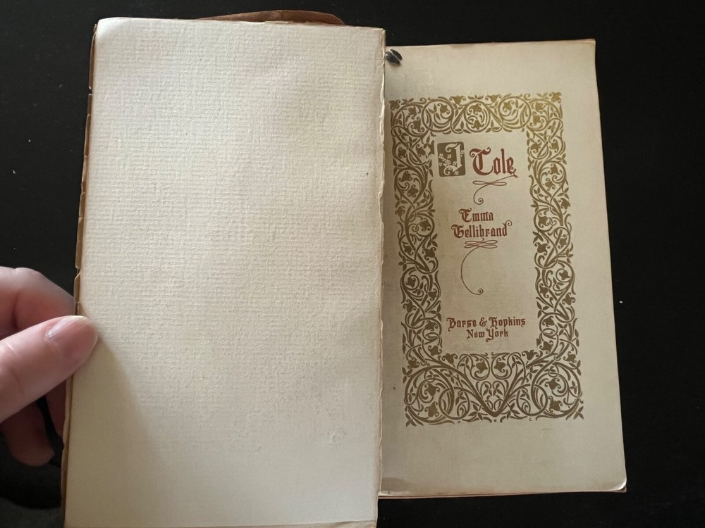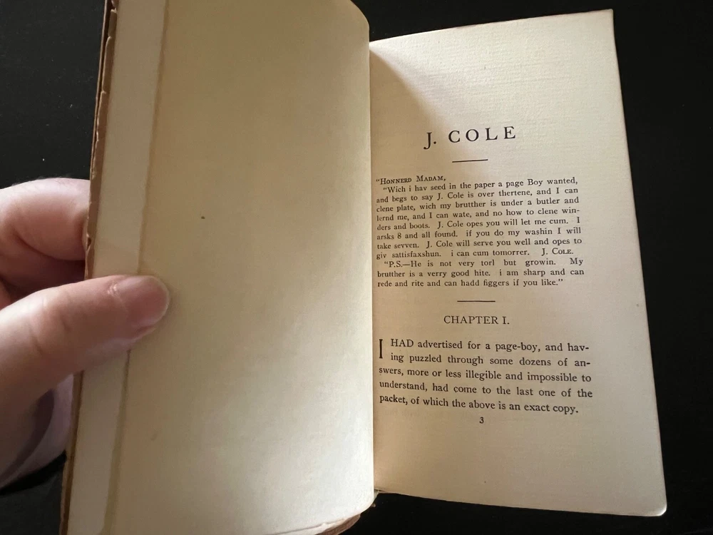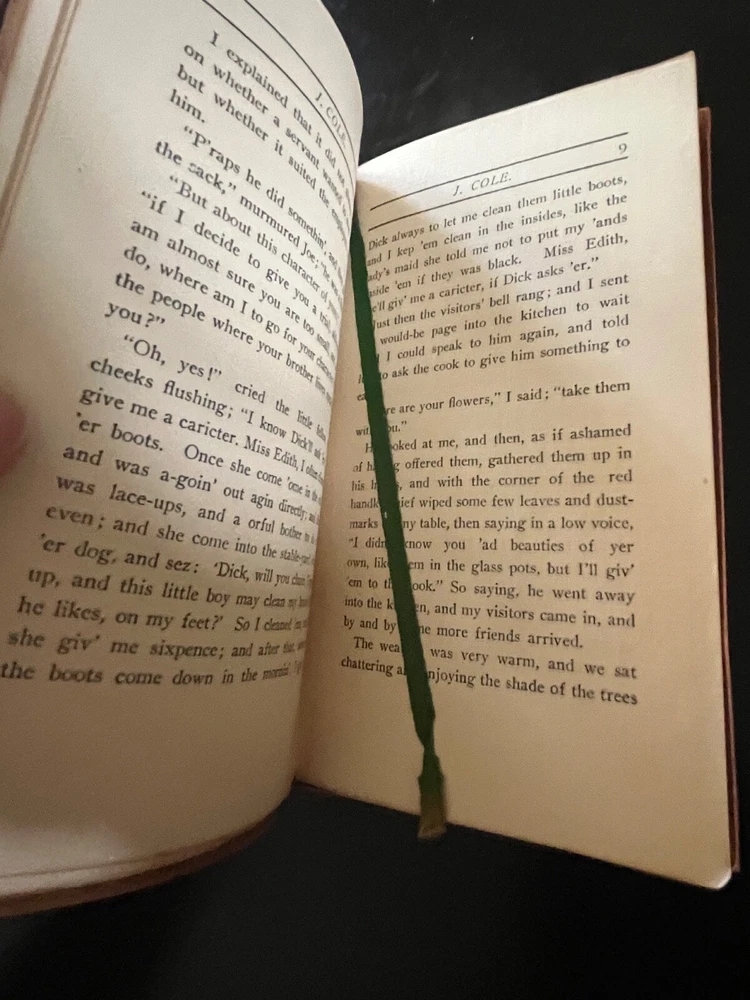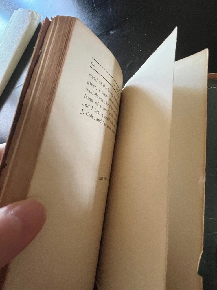 J. COLE by Emma Gellibrand Barse & Hopkins, New York (published between 1909-1925, no date) "J. Cole" by Emma Gellibrand is a captivating novel that delves into the life and experiences of its titular character, J. Cole. The story follows J. Cole's journey through the twists and turns of life, love, and personal growth. Set against a backdrop of both urban and rural landscapes, the novel explores themes of identity, self-discovery, and the pursuit of dreams. J. Cole faces a series of challenges and opportunities, navigating relationships, career aspirations, and the complexities of modern life. Readers are drawn into the emotional depth of J. Cole's experiences, as the character grapples with personal demons, forms meaningful connections, and seeks to define their place in the world. Emma Gellibrand's storytelling weaves together elements of romance, self-reflection, and the complexities of human relationships. "J. Cole" is a tale of resilience and transformation, offering readers a window into the inner workings of its enigmatic protagonist's heart and mind. It is a story of hope, growth, and the power of the human spirit to overcome adversity. Soft Leather / Suede cover, green ribbon bookmark, the first page is loose, otherwise binding is good, gold gilt lettering