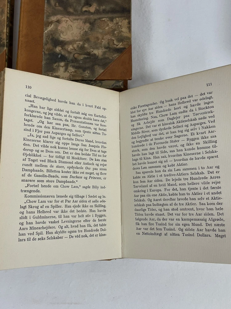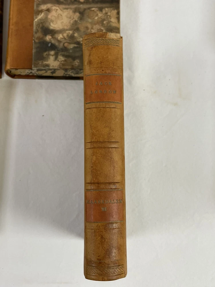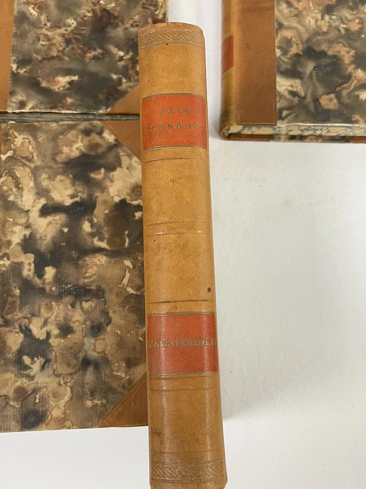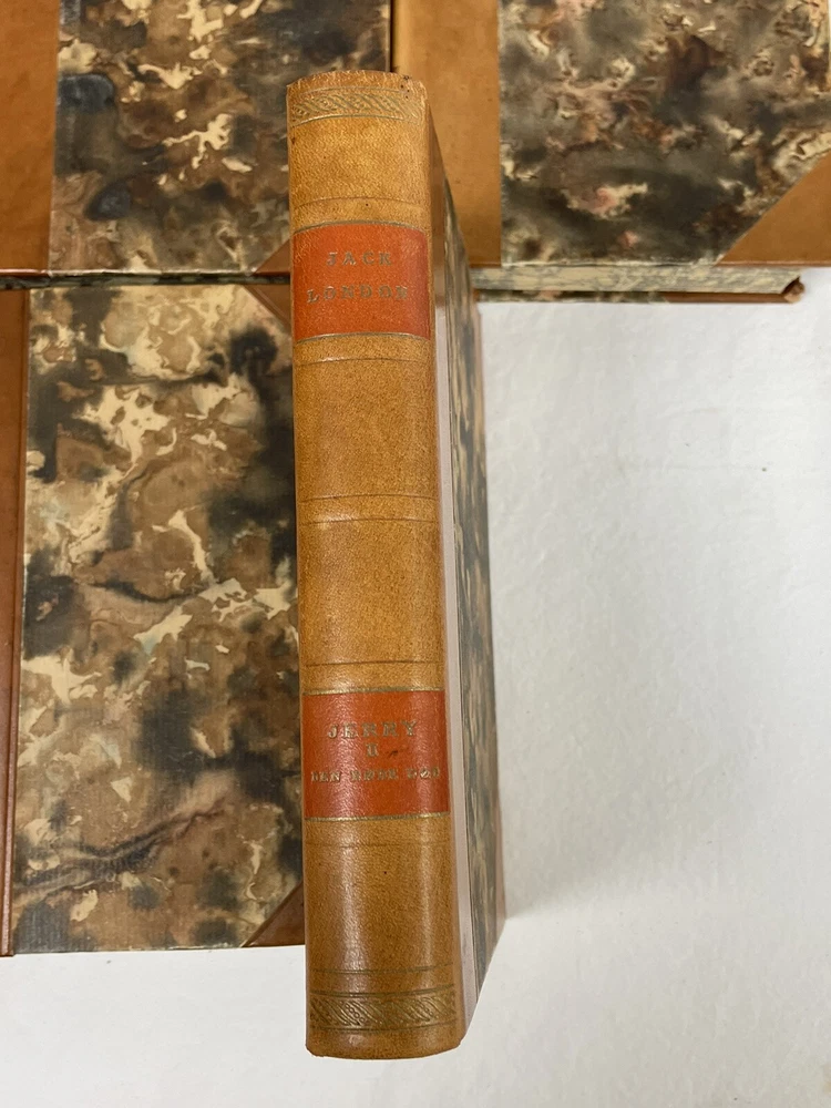 JACK LONDON Leather-Bound Set. 14 Vols. Danish. Published by Forlag 1910-1960. VAGABONDLIV MAANEDALEN I MAANEDALEN III OSTERSROVERNES KONGE JERRY I JERRY II SYDHAVET MARTIN EDEN I MARTIN EDEN II SNEENS DATTER I SNEENS DATTER II EN KLONDIKE HELT I EN KLONDIKE HELT II HANS FAEDRES GUD KVINDEMOD