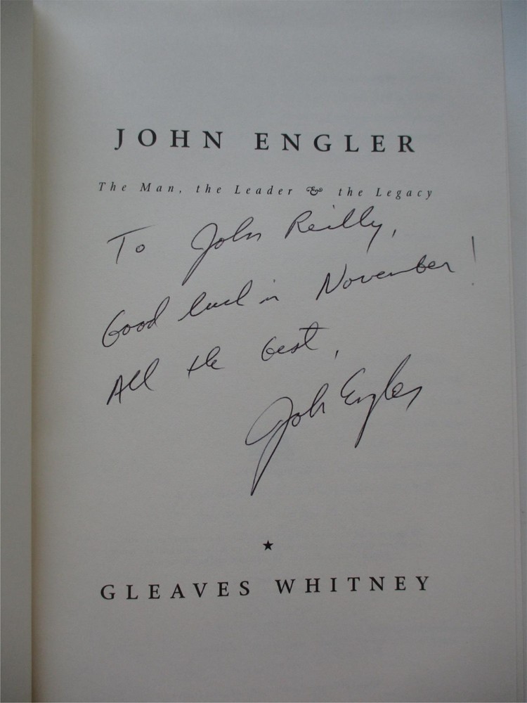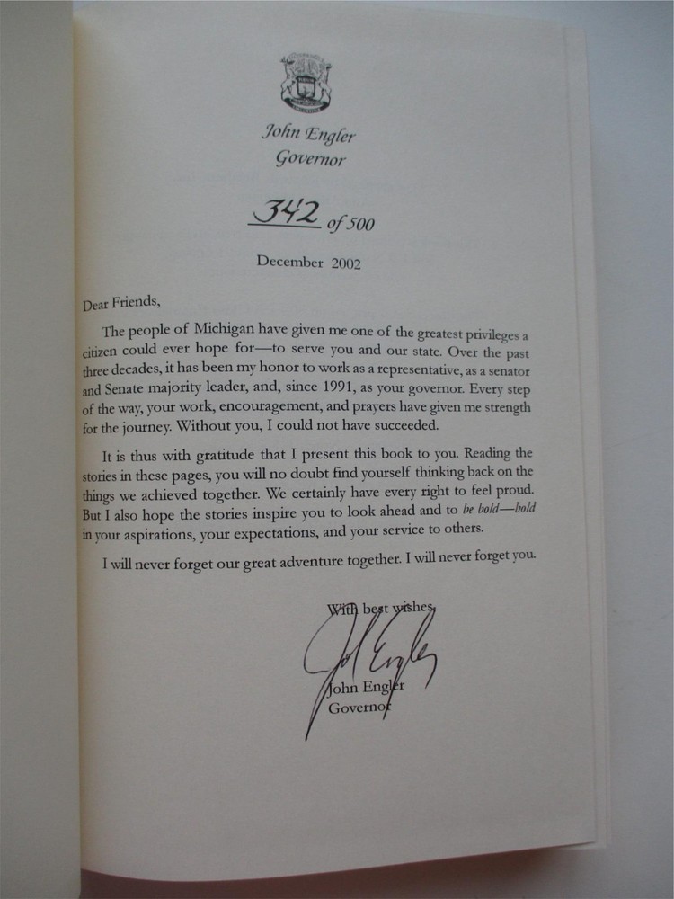 JOHN ENGLER The Man Leader Legacy SIGNED Biography 2002 Michigan Governor NICE JOHN ENGLER The Man Leader Legacy SIGNED Biography 2002 Michigan Governor NICE FORMAT: Bonded Leather Hardcover, no dust jacket issued. Gold gilt on page edges and an attached satin book ribbon. Engler's signature on preface page as well as salutation and signature on Title page. Copyright 2002, First Edition. Includes many photographs. CONDITION: This book is in clean and LIKE NEW condition. It has a strong spine and shiny cover. Inside, pages are clean with no writing or marks, with the exception of Engler's signatures on preface and title page. Please see photos. PAYMENT & SHIPPING TERMS: Please pay within 3 days of item purchase. We ship promptly upon receipt of payment. Under a new policy, eBay is collecting state sales tax where appropriate. Our "Free Shipping" offer includes USPS Media Mail rate shipping in the USA. This rate typically delivers in 5-9 days but can take as long as 30 days to some areas. If you need your purchase quickly, we strongly urge you to select the Priority shipping option at checkout to insure timely delivery. International Buyers Please Note: * Import duties, taxes and charges are not included in the item price or shipping charges. These charges are the buyer's responsibility. * Please check with your country's customs office to determine what these additional costs will be prior to bidding/buying. * We do not mark merchandise values below value or mark items as "gifts" - US and International government regulations prohibit such behavior. Listing and template services provided by inkFrog