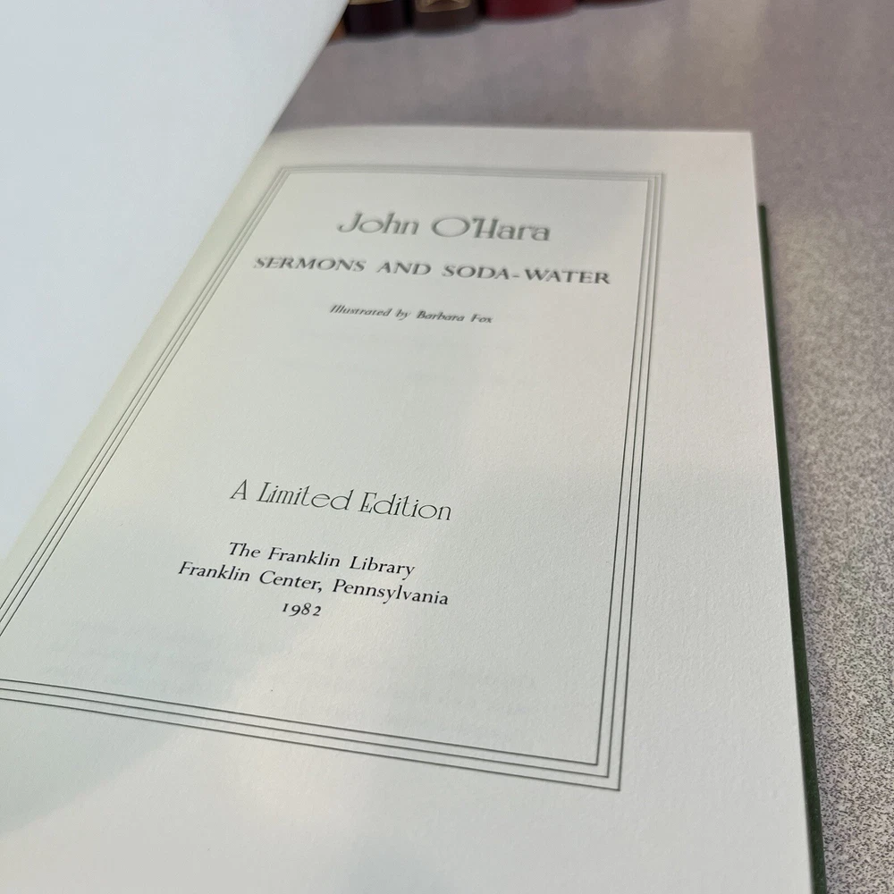 JOHN O'HARA "Sermons & Soda-Water" 1982 Full Leather Hardcover Very Good: Tight Binding, Clean pages, no markings, minimal wear only. Please check pictures. This Limited Edition is Published by The Franklin Library Exclusively For Subscribers to "The Collected Stories of The World's Greatest Writers" The Collected Stories of The World's Greatest Writers 1977 - 1985 (100 Volumes) All books in the Franklin Library Collected Stories of the World's Greatest Writers were bound in full genuine leather with silk moiré end papers Ships Media Mail to save you $$$. This means it could take between 5-9 days to be delivered, (In rare occasions 7-14 days). If you need your book faster, please consider upgrading to Priority Mail. We add books weekly, check out our store for more related works. Please contact us if you have any questions or issues. Thank you.