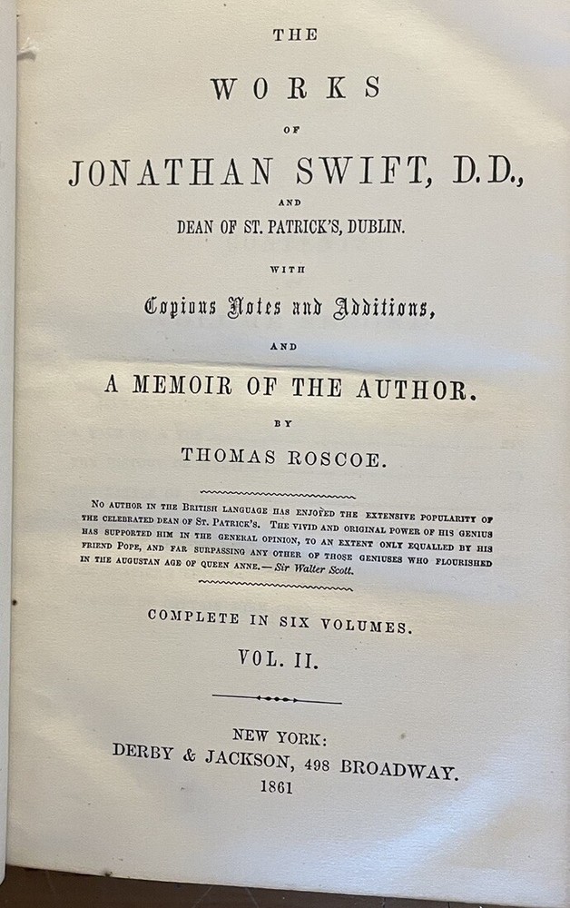 JONATHAN SWIFT, D.D. Leather New York 1861 Volume II. Shipped with USPS Media Mail....