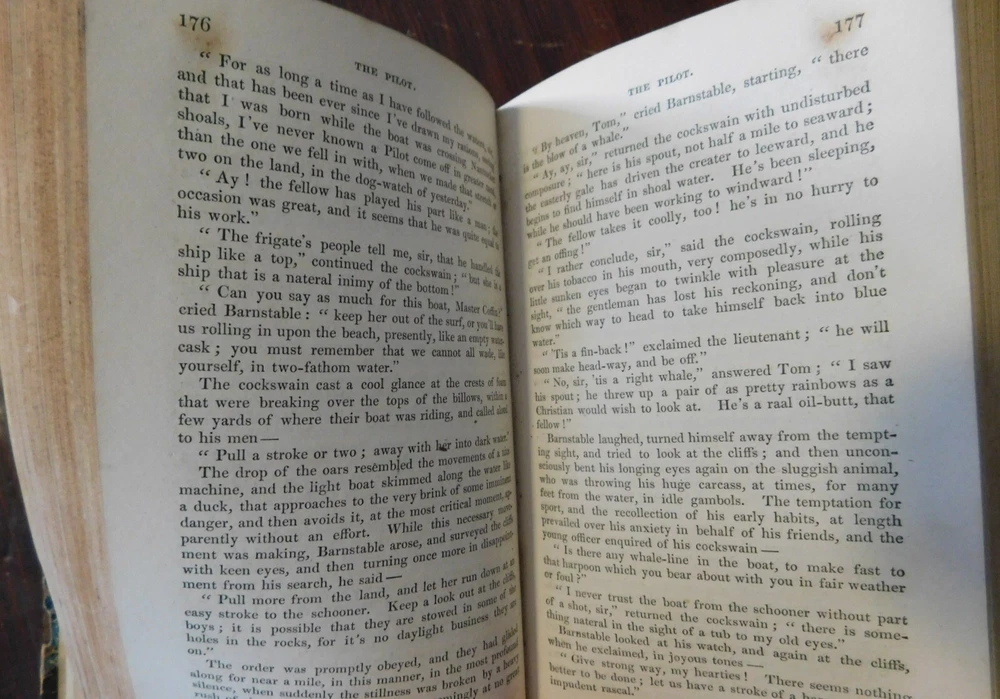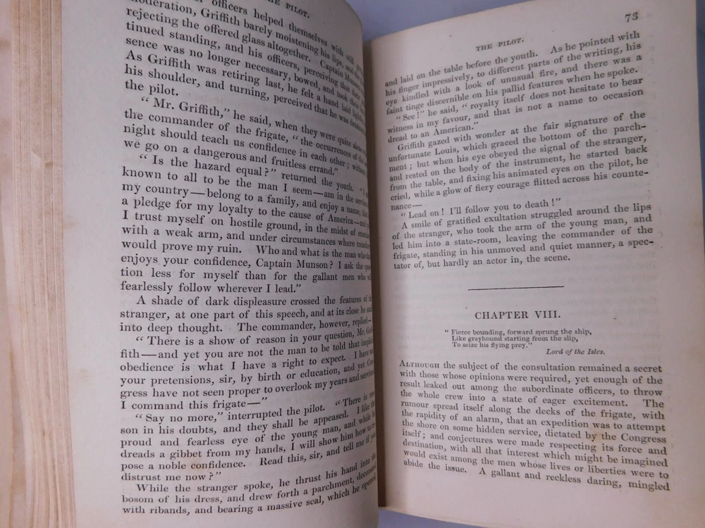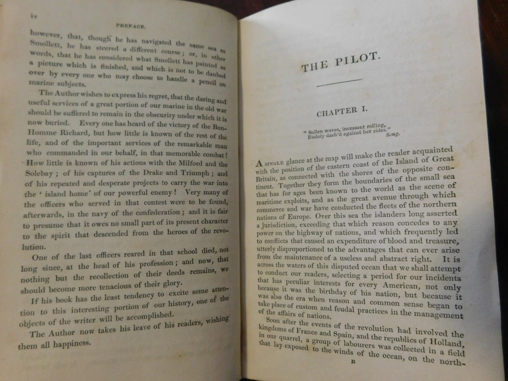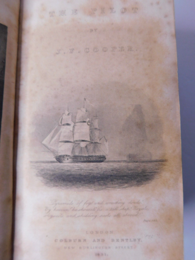 Description : A very good copy of the 1831 British edition of "The Pilot," first published in America in two volumes in 1823. It is considered the earliest example of nautical fiction in American Literature. The book is Coopers fourth novel. Condition: 8vo. 420 pages - Original paper boards and leather corner tips over a new leather spine using the original black leather spine label. The book is square, the binding is tight, and the endpapers have been refreshed. Some rubbing to the paper boards, with light edgewear and several bumps to the outer edge. Leather corner tips are bumped and rubbed. The interior is clean and unmarked with foxing and toning to the vignette title page and illustrated frontispiece. Overall, a very good copy of this early Cooper novel, and one of his most renowned works.