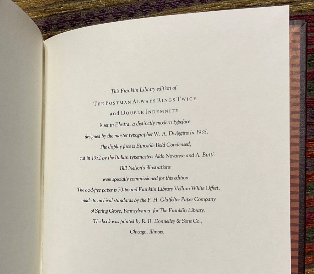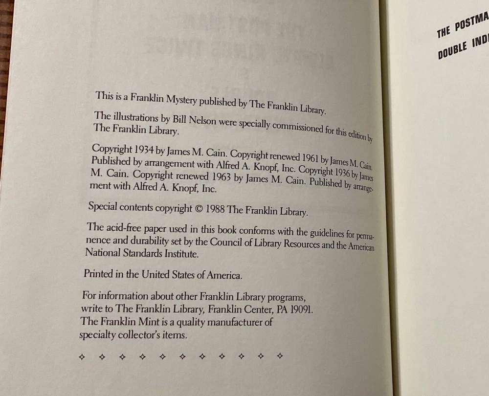 This luxury edition book is a must-have for collectors of mystery and thriller literature. The two classic works of James M. Cain, The Postman Always Rings Twice and Double Indemnity, are bound in one convenient package. The leather binding makes this book a valuable addition to any collection. The book is in its original form and is not personalized or signed. It is published by Franklin Library and features illustrations by Bill Nelson. The topic and subject of the book are mystery and literature, respectively. This limited edition book is a great find for any book lover or collector. Shipped with USPS Mail. All items are sold as is. Please view pictures carefully as they should be considered part of the description. We try to represent the items as best as we can. If you choose to leave a positive review, we will do the same. Thank you for shopping!