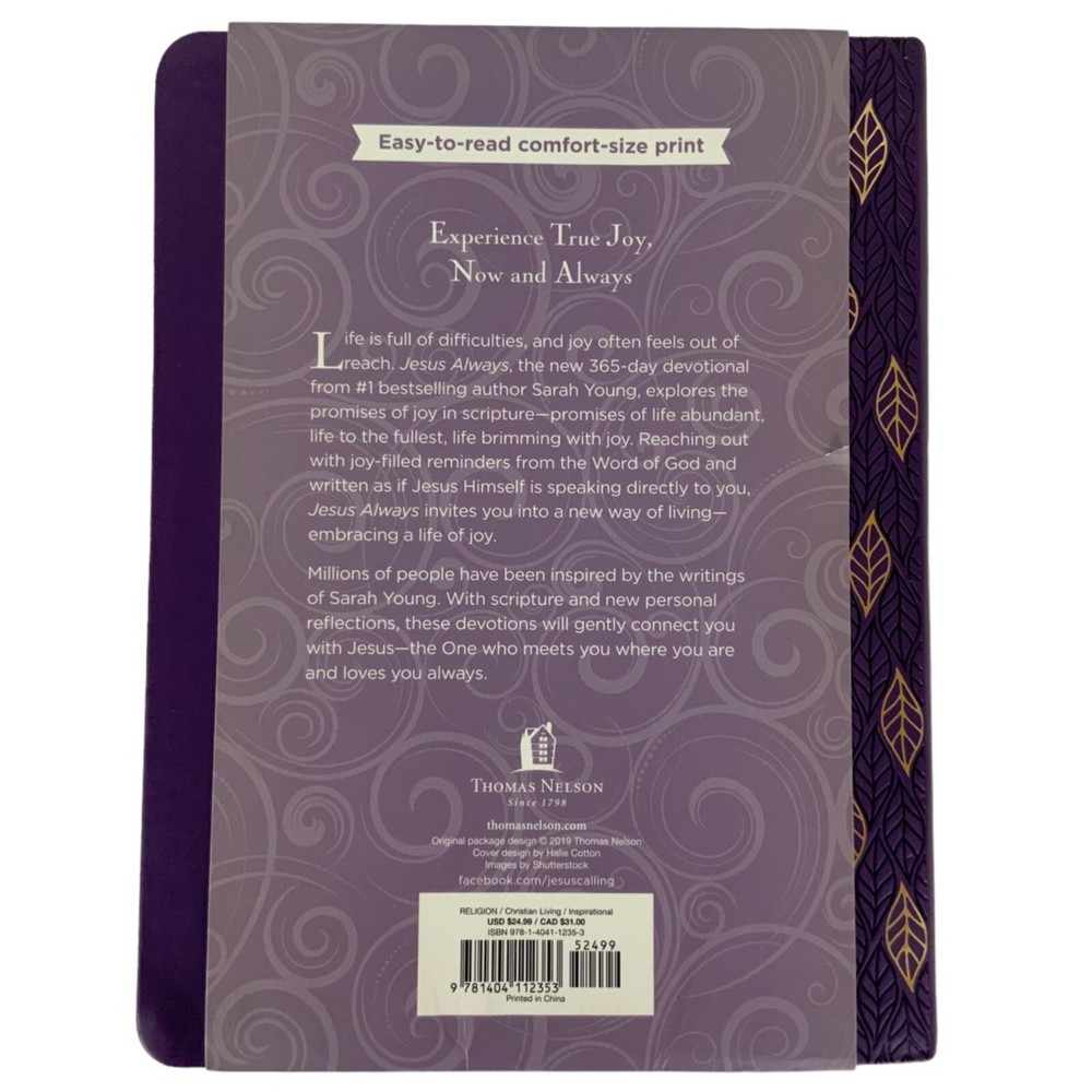 Jesus Always Embracing Joy In His Presence 365-Day Devotional By Sarah Young A 365-day devotional by Sarah Young, designed to uplift and guide through scripture and prayer. Comforting, easy-to-read print for daily inspiration. • 365-day devotional • Written by Sarah Young • Easy-to-read comfort print • Hardcover binding • Inspirational daily readings • Purple cover with gold accents Condition: Pre-Owned Good Minor scuffs on inside cover page. Presentation page has writing. Remaining pages are unmarked.