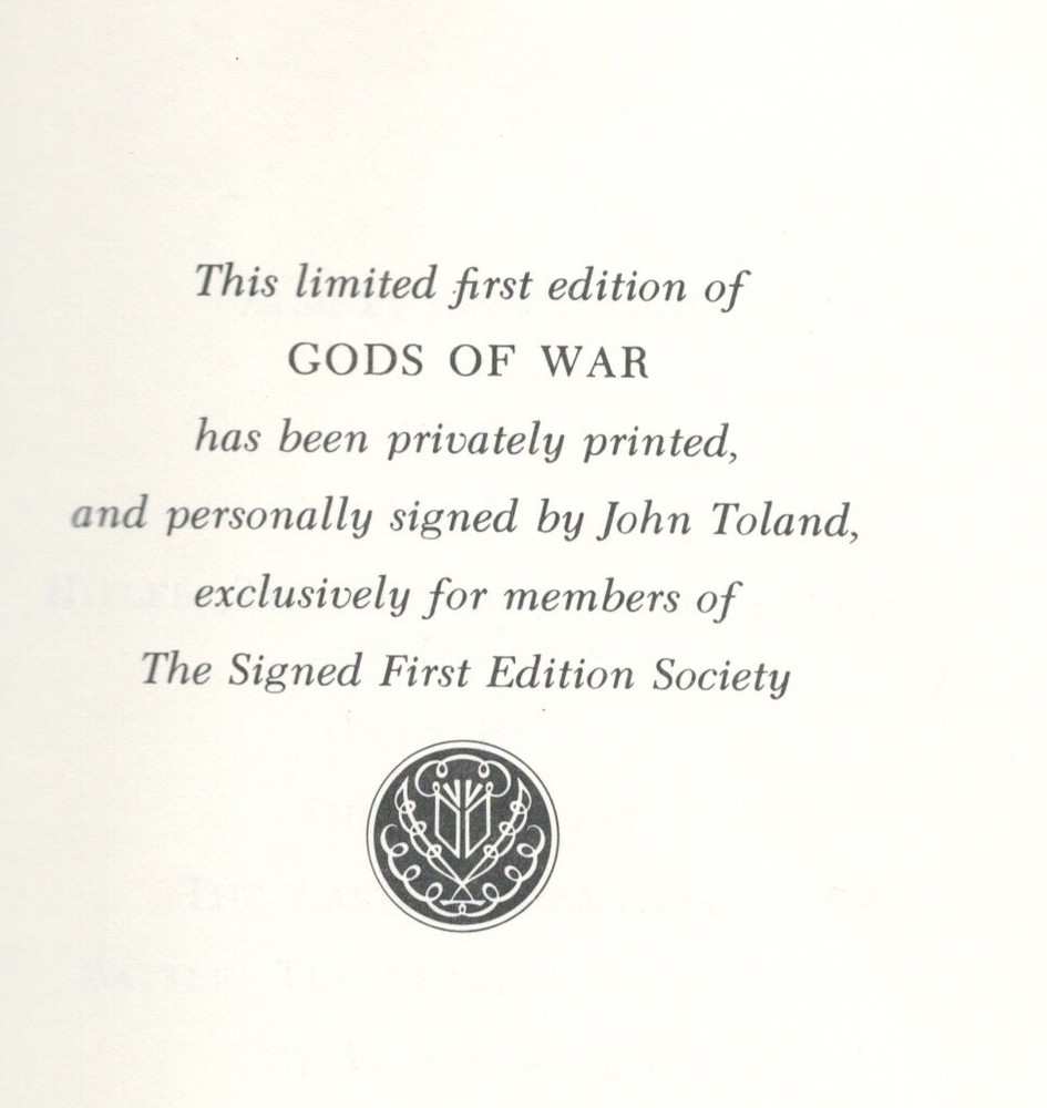 John Toland. WWII. Signed limited first edition, Leather bound, 6.5x9.5, marbled endpapers, gilt edges, illustrated. Near-new condition. The following comes from a letter of the Franklin Mint which is included with the book: Historian John Toland wrote a number of distinguished non-fiction books devoted to the Pacific during World War II. Toland won the Pulitzer Prize for The Rising Sun. In this book, he turned to fiction. Gods of War is a fast-paced, compellingly readable epic depicting the triumphs and tragedies of soldiers as well as civilians on both sides of the conflict.