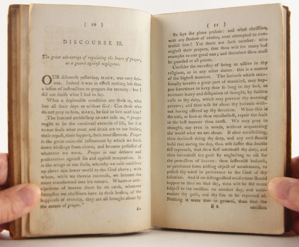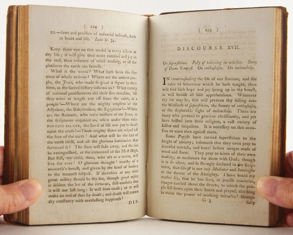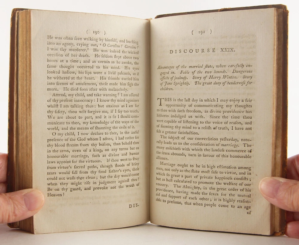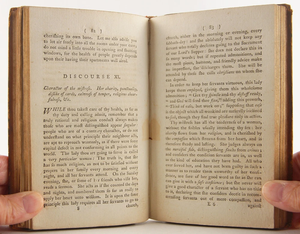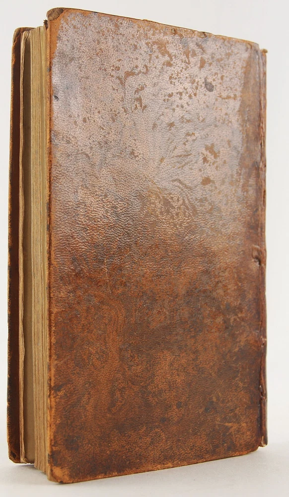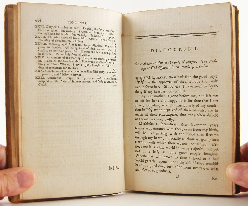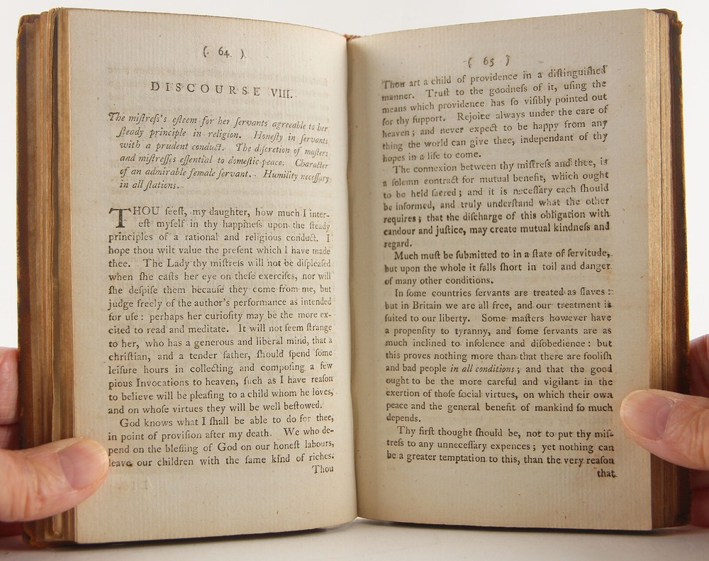 Domestic happiness, promoted; in a series of discourses from a father to his daughter, on occasion of her going into service; calculated to render servants in general virtuous and happy: with various characters, anecdotes, fables, and reflections. Being for the most part adapted also to the use of Sunday-schools; abridged from Virtue in humble life by Jonas Hanway 1795 new edition with alterations, 'Printed for J. Sewell; and F. and C. Rivington' (London), 4 3/8 x 7 inches tall full leather bound, xvi, [1], 2-208 pp., lacking engraved frontispiece but otherwise complete. A rare revised edition of this work, first published in the year of Hanway's death, 1786. A well-worn period binding, with a one-inch crack to the top, and two-inch crack to the bottom of the leather along the spine. Slight to moderate soiling, rubbing and edgewear to covers, with bumped and worn-through tips. Cracking along both exterior joints, but the binding holds firmly. Ink period prior owner's name to front pastedown. One-inch tear, a small hole and erased pencil notations to blank front free-endpaper. 1847 ink prior owner's name to top margin of title page. Front gatherings (through page 22) slightly pulled, but the binding is quite solid. Despite these detractions, still a solid reading / reference copy of this rare issue, albeit sans frontispiece. The English Short Title Catalog only lists three institutions worldwide with a copy - Oxford University and University of Manchester in UK and Universidad Complutense de Madrid. Author Jonas Hanway (1712-1786), was a British philanthropist and traveller. He was the first male Londoner to carry an umbrella and was a noted opponent of tea drinking. Hanway created seventy-four printed works, mostly pamphlets. In addition to this work, of literary importance is also the Historical Account of British Trade over the Caspian Sea, with a Journal of Travels, etc. (London, 1753).