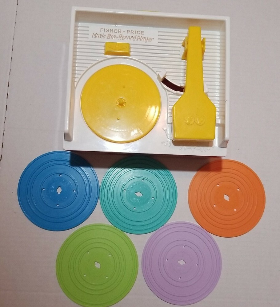 KIDS Fisher Price Music Box Record Player 2014 5 Discs Reproduction USED. Condition. Box Knob does not turn fully to play music. Sometimes plays and sometimes doesn't play. Selling as is if you want it just as a piece of childhood memory or you can get the knob fixed. I was told the knob spring needs to be adjusted Shipped with USPS Priority Mail.