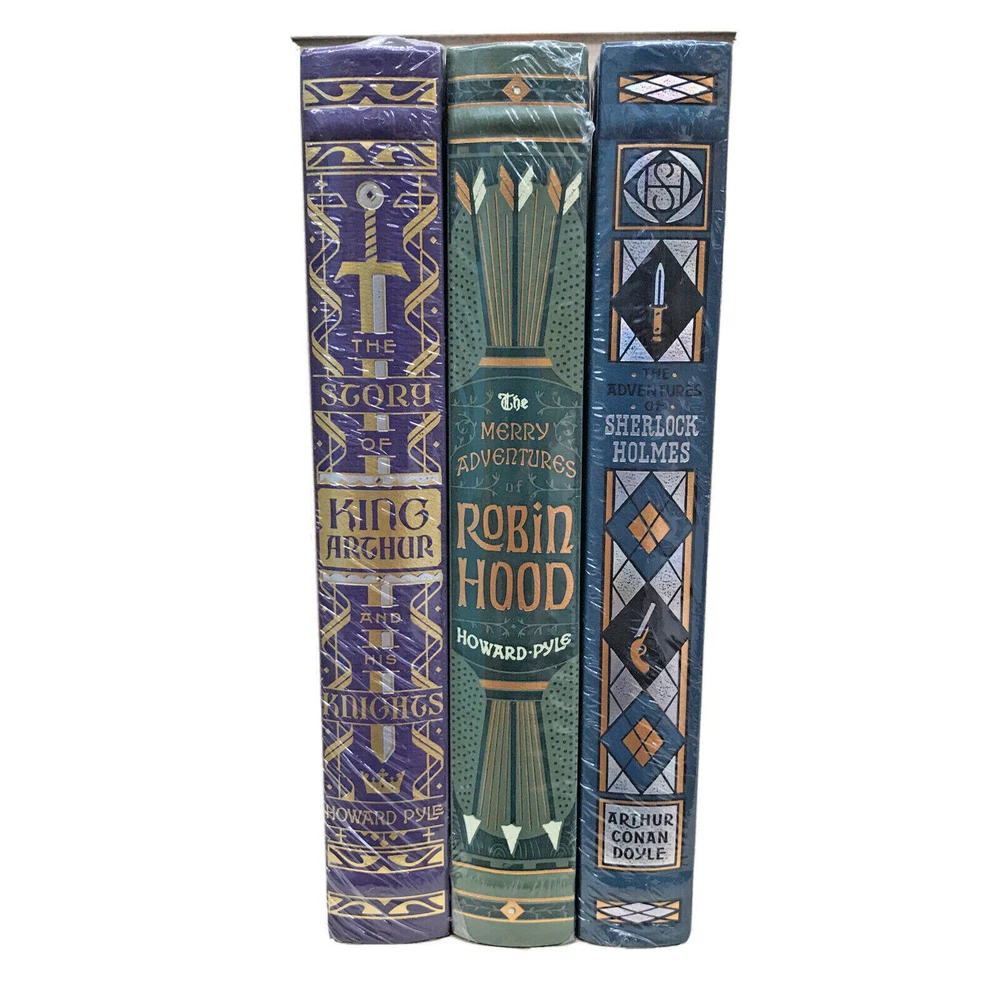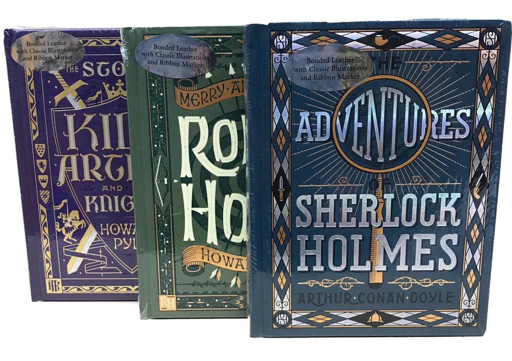 Three Collectible Classic Books Brand New, Bonded Leather, Collectible Editions *** THE STORY OF KING ARTHUR AND HIS KNIGHTS *** by Howard Pyle and *** THE MERRY ADVENTURES of ROBIN HOOD *** by Howard Pyle and *** THE ADVENTURES of SHERLOCK HOLMES *** by Arthur Conan Doyle These editions, bound in genuine bonded leather with decorative page edges and a ribbon bookmark, are an elegant addition to any home library and make a treasured heirloom. The Merry Adventures of Robin Hood The Merry Adventures of Robin Hood tells the classic tale of the mischievous Master of Sherwood Forest, who lives the outlaw life with Little John, Friar Tuck, Will Scarlet, and his band of Merry Men, bedeviling the implacable Sheriff of Nottingham during the reign of Richard the Lionhearted. This edition features more than 40 full-color illustrations by author Howard Pyle that bring the timeless text to life. The Story of King Arthur and His Knights When the young age Arthur pulls from the stone an embedded sword that none of the knights of the kingdom can budge, his future as the King of England is foretold. This imaginative retelling of the classic Arthurian legends recounts the story of Arthur's formation of the Knights of the Round Table, his securing of the enchanted sword Excalibur, and his wooing of the Lady Guinevere. Included as well are the legends of Sir Pelleas, the story of Sir Gawaine's pursuit of the White Hart, and tales of Merlin the magician, Morgana Le Fay, the Lady of the Lake, and many others. The Adventures of Sherlock Holmes Sherlock Holmes is the greatest detective in fiction, a crime-solver gifted with powers of observation that allow him to see clues that ordinary detectives easily overlook. For more than a century, his adventures have thrilled generations of readers with crimes that are seemingly insoluble until the great detective steps in and applies his skills of deductive reasoning. This volume collects seven of Holmes's most challenging cases, including "A Scandal in Bohemia," "The Red-Headed League," "The Speckled Band," "The Five Orange Pips," "The Blue Carbuncle," and "The Beryl Coronet." It also features the full-length novel The Hound of the Baskervilles, about a legendary ghostly hound that has haunted generations of a noble family living in Baskerville Manor. All of the stories feature art by Sidney Paget. It features classic illustrations, an elegant bonded-leather binding, distinctive gilt edging, and a ribbon bookmark. Decorative, durable, and collectible, this book offers hours of pleasure to readers young and old and is an indispensable cornerstone for any home library. These exquisite books feature an elegant bonded-leather binding, a ribbon bookmark, distinctive gilded edging. They're books that will be cherished by readers of all ages. Send these books as a gift! We ship these items in gift quality condition with no price stickers or other markings. Buy with confidence from an established seller - we have over 20 years of eBay sales experience and more than 24,000 ratings! Shipped from a smoke-free, temperature controlled environment To see more great items and Value Packs at terrific prices, please visit our ebay store