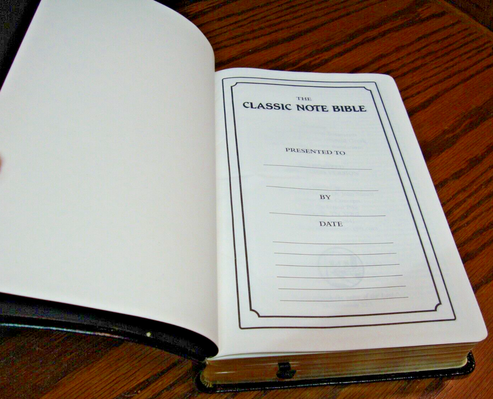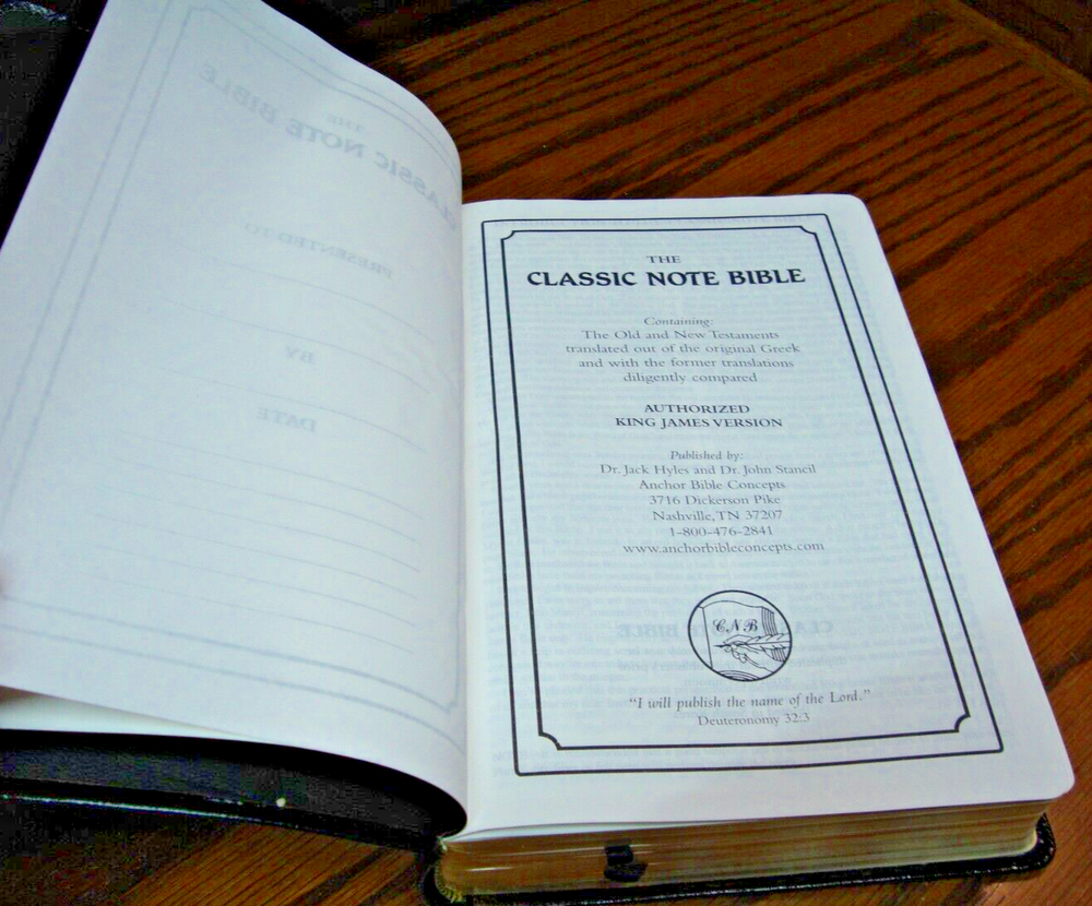 NEW! In sealed packaging and gold & white gift box. Would make an amazing gift for any occasion but especially for Christmas, Easter or birthday. This Classic Note Bible KJV Old New Testaments King James version is a genuine leather covered book with gold lettering and gold page edges. It has blank pages for taking notes. It is not red-letter. It is a special edition collector's item that measures 8.75" from top to bottom, 6" from left to right, and 1.8" in height. The Bible has 979 pages and is written in English. This item is perfect for young adults, ages 9-12, and adults who are looking for a reliable and personalized Bible. The Bible is published by Anchor Bible Concepts and authored by Jack Hyles. This religious and spiritual book is a non-fiction narrative that is intended for personal use.