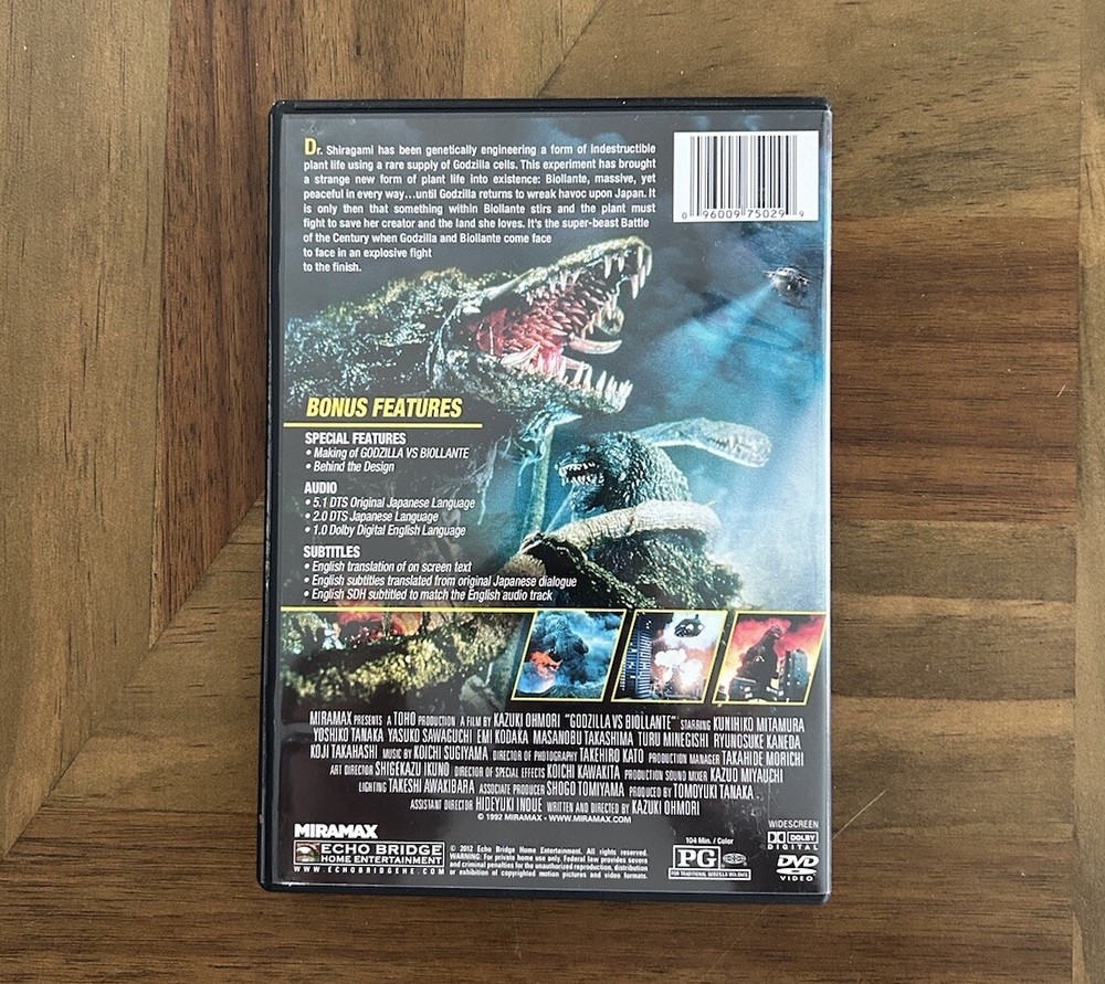 Kazuki Ohmori’s GODZILLA VS BIOLLANTE (1989) Miramax 2012 Widescreen DVD. Condition is Very Good. Shipped with USPS Media Mail.