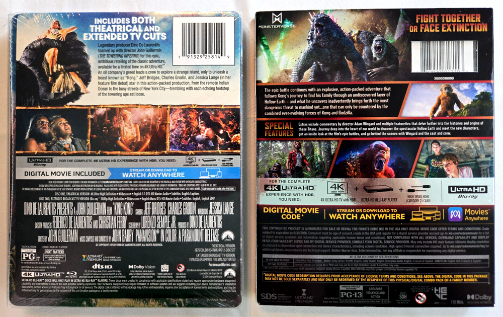 Own: King Kong (1976) 4K 4K + Blu-ray + Digital Copy + Slip Cover Limited Edition Steelbook No dents, no scratches! & Godzilla x Kong: The New Empire 4K 4K + Digital Copy + Slip Cover (Not a Steelbook) FACTORY SEALED U.S. RELEASES Ships in a padded box with a tracking number (in the U.S)