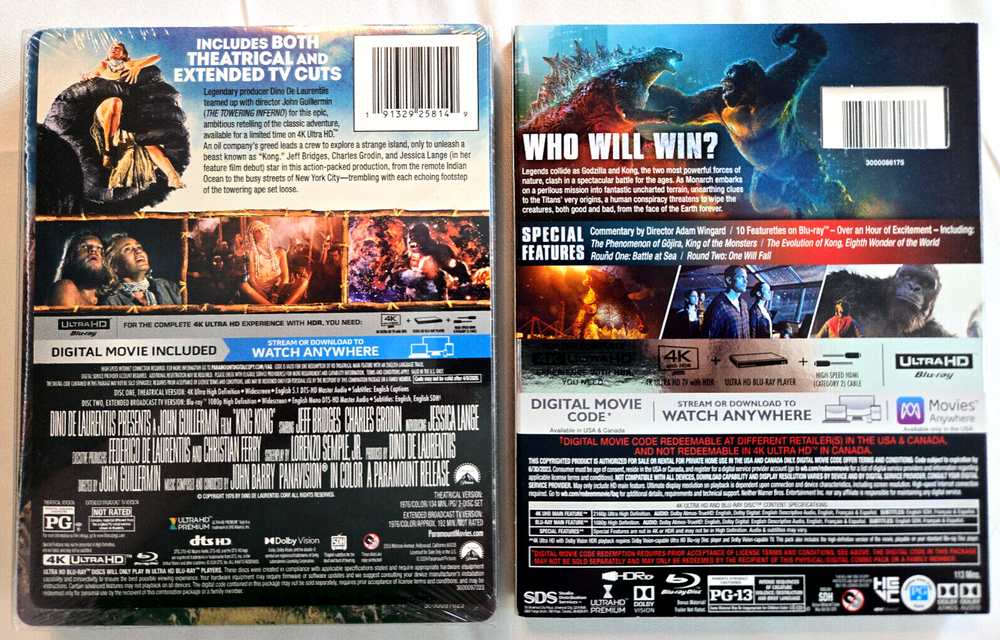 Own: King Kong (1976) 4K 4K + Blu-ray + Digital Copy + Slip Cover Limited Edition Steelbook No dents, no scratches! & Godzilla Vs. Kong 4K 4K + Blu-ray + Slip Cover (Digital Copy Expired. Not a Steelbook) FACTORY SEALED U.S. RELEASES Ships in a padded box with a tracking number (in the U.S)