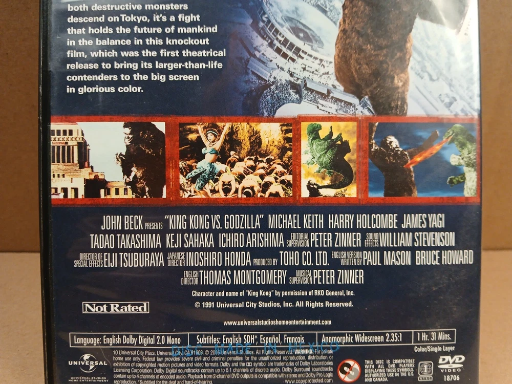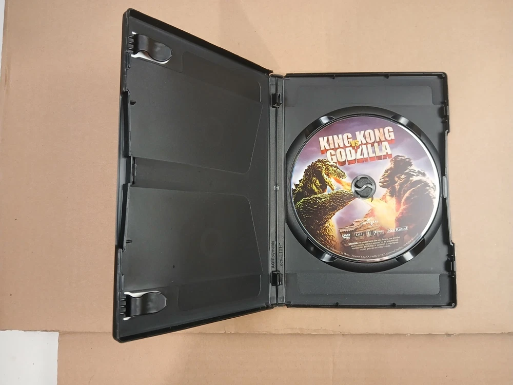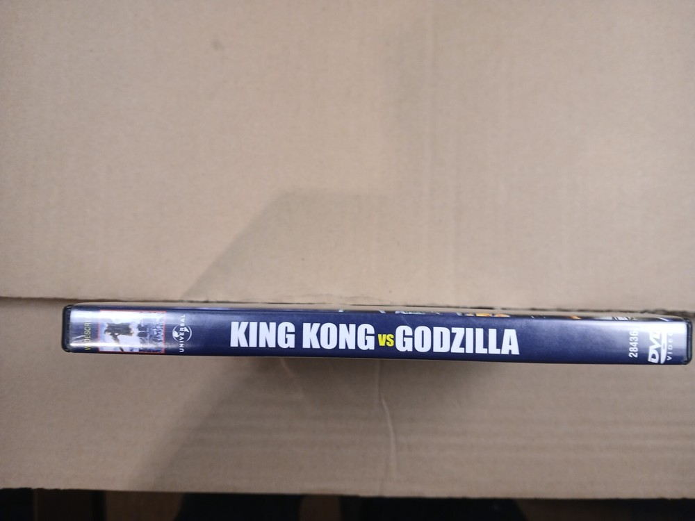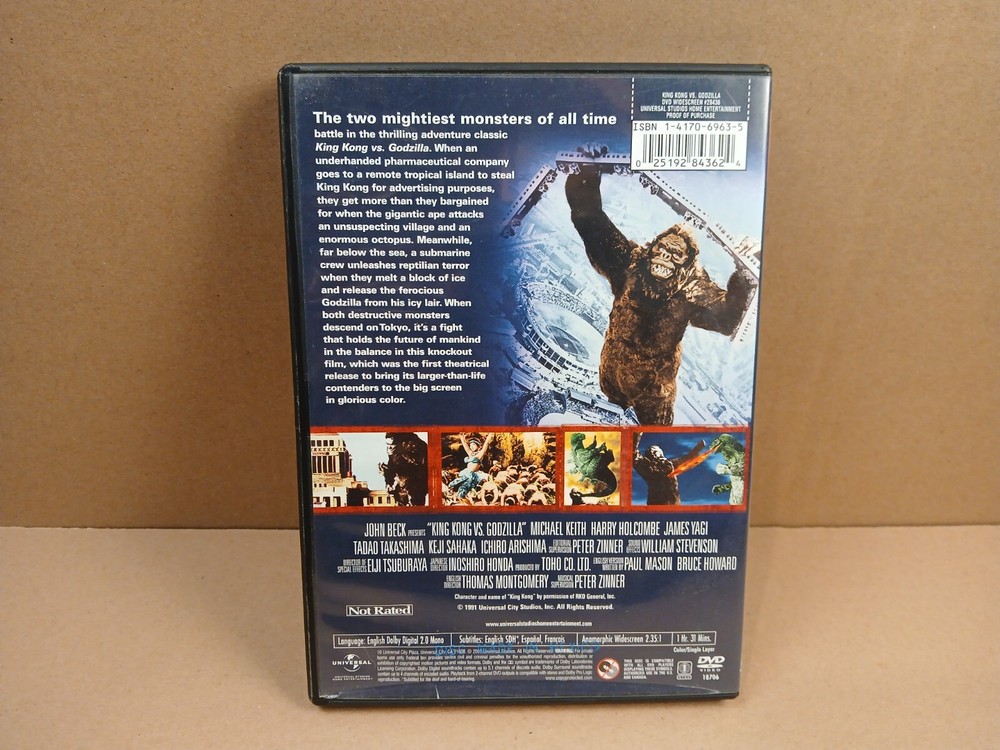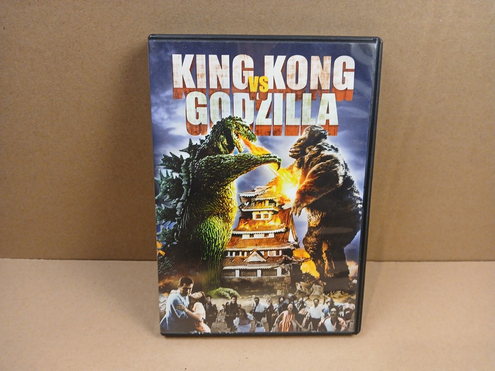 this is a used preowned dvd movie copy of king kong vs. godzilla.first off i watched this movie myself and it played good.it is an english dubbed movie.anyway there is wear on the case of this movie.there are some scuffs,scratches,nicks and dings throughout all sides of the case.the outside plastic covering has some damage along the bottom of both sides of the case including chipping and a large upraised crease.there is also a crease in the outside paper insert on the front of the case on the top right hand corner area.the inside of the case has some spotting,scuffs,scratches and a few dust particles.there is a spot where a magnetic sticker was removed.the play side of the disc looks pretty decent.there is a few very light slight scratches and some dust particles.thank you for looking at this listing.