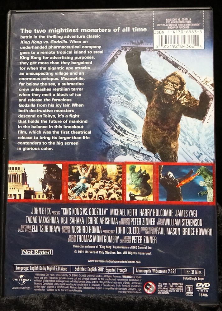 King Kong vs. Godzilla Item Description King Kong vs. Godzilla📀 NR (Not Rated) 1 Collectible DVD. Runtime: 1 Hours 31 Mins. No Digital Copy. Check Pictures For More Info. About Our CD's, DVD's, VHS's And Games: From rare hard to find items to popular current titles, we have it all. We have thousands of CD's and DVD's in stock. Some of our discs have been ex-rentals, privately owned, or refurbished. Please check pictures for markings or stickers. Check out our other sales and we are sure you will find tons of items you love at great prices! Condition: The DVD are guaranteed to play perfectly! All DVD have been inspected for quality and are in working condition. NOTE TO COLLECTORS... We are Sellers, we due are best to provide an accurate description of the item to the general public however, as a "Collector" it is incumbent upon you to ask specific questions regarding conditions that are important to you and your endeavor. We assume that you are the professional and expect you to exercise your expertise in matters regarding your acquisitions. Items listed in Good Condition is for the disc itself cases can have chips or cracks. Factory Sealed Items can only be returned Factory Sealed. We are happy to assist you by answering any questions you may have. Contact US We can be contacted at any time through eBay messages if you have any questions, comments or product requests. We will respond to you within 24 hours and do our best to help you out! We encourage our customers to contact us with any questions or concerns! We'd like to be sure you are completely satisfied with your purchase Shipping Information Please read entire description before bidding or purchasing. If you have any questions please don't hesitate to send us a message through eBay and we will respond as soon as we can. We try to reply within 24 hours (even on weekends). All import duties or taxes are the responsibility of the buyer. Refer to your country's customs office if you have questions. U.S. Media Mail is the method of shipment. Orders are delivered Monday through Friday usually before 4 pm via the U.S. Postal Service. Priority Mail shipping is available upon buyer's request Shipping to areas outside the US are calculated by address. Please contact us via eBay, if your order doesn’t arrive within the dates provided at the time of purchase , before leaving feedback. In Closing...By placing a bid on this item, you acknowledge that you have completely read, understand and agree to abide by the terms, conditions and restrictions in this listing.