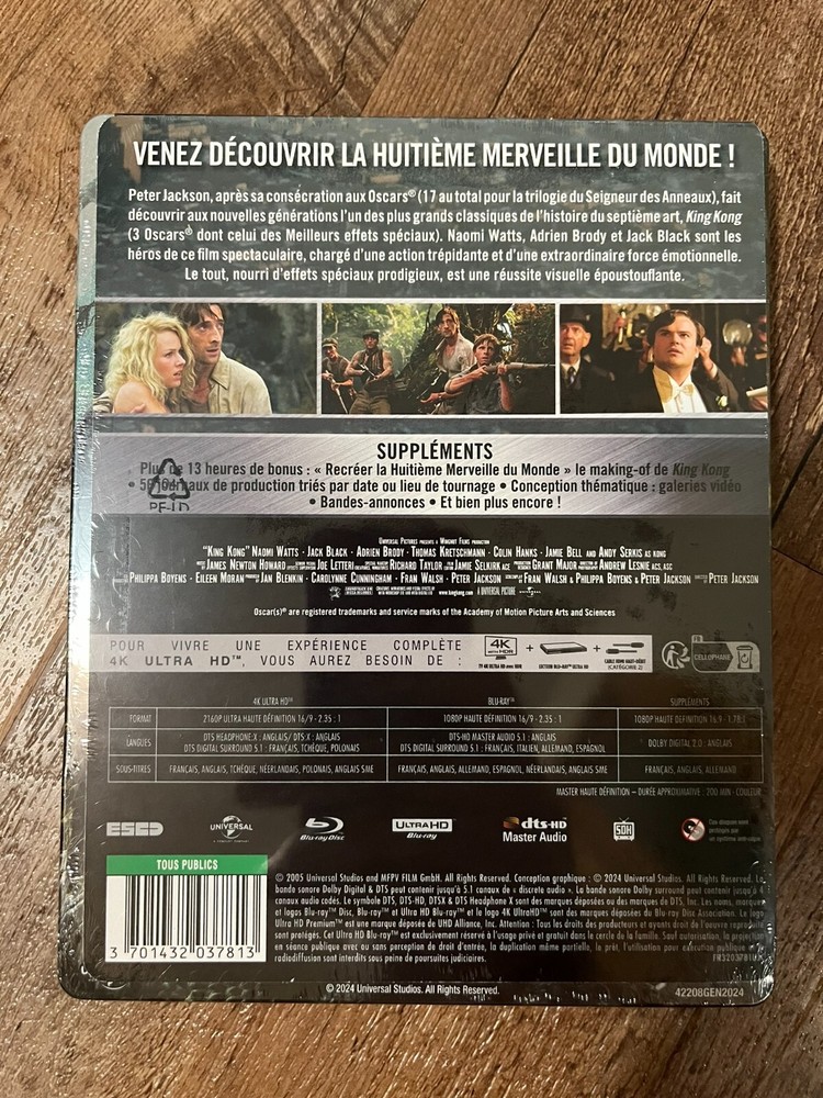 Up for auction : King Kong [2005] with Embossed Steelbook Case (4K UHD + Blu-ray, EU Import, Region Free). This is a French import, but the menus/audio track will default to English in your player automatically. Item is BRAND NEW/SEALED ! Video Codec: HEVC / H.265 Resolution: Upscaled 4K (2160p) HDR: HDR10 Aspect ratio: 2.35:1 Original aspect ratio: 2.39:1 Audio English: DTS:X English: DTS-HD Master Audio 7.1 (48kHz, 24-bit) English: DTS Headphone:X French: DTS 5.1 Czech: DTS 5.1 Polish: DTS 5.1 Subtitles English SDH, French, Czech, Danish, Dutch, Finnish, Greek, Mandarin (Traditional), Norwegian, Polish, Swedish Discs 4K Ultra HD Blu-ray Disc Single disc (1 BD-100) Packaging SteelBook Playback 4K Blu-ray: Region free 2K Blu-ray: Region free Ships within 24 hours via USPS Priority Mail (2-3 days) with delivery confirmation. Returns accepted within 30 days of receiving your item if you're not 100% satisfied! Return shipping will be paid for by the buyer unless a mistake is made on my part. Sorry, no international shipping is available. PayPal payments only please. Bid with confidence! 30 day money back guarantee - all orders go out the following business day - highly rated for BLAZING FAST shipping