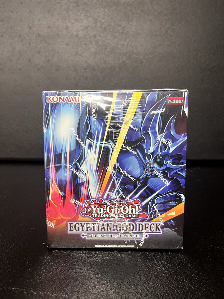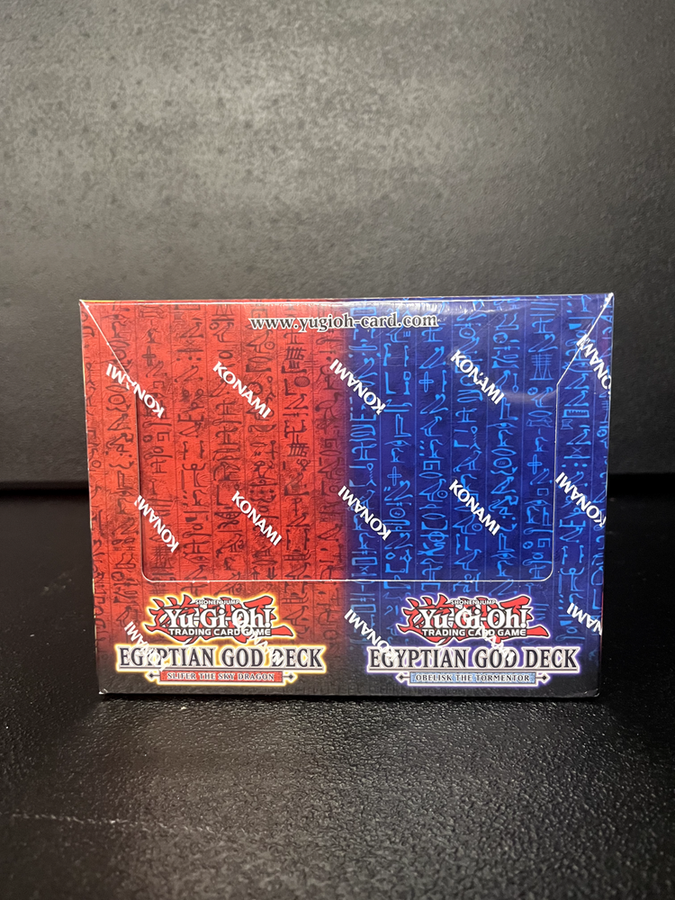 Description of Box: Awaken the power of the Egyptian God Cards! If you’ve ever wanted to build a Deck around an Egyptian God Card but didn’t know where to start, look no further than the Egyptian God Decks! Egyptian God Deck: Slifer the Sky Dragon/Egyptian God Deck: Obelisk the Tormentor serve up simple strategies to Summon and win with either Slifer the Sky Dragon or Obelisk the Tormentor. Slifer the Sky Dragon Slifer powers up depending on how many cards you have in your hand, so this Deck uses Token-generating effects to help you gather the 3 required Tributes while using fewer cards from your hand. After you have Slifer on the field, power it up with cards that let you draw more cards, like the brand-new Thunderforce Attack! Based on Slifer’s signature attack, this Spell can destroy all your opponent’s face-up monsters at any time, but if you use it during your own Main Phase you can draw a card for each monster destroyed! Obelisk the Tormentor Unleash the true power of Obelisk the Tormentor by Tributing 2 monsters you control and wipe your opponent’s monsters off the field! This Deck uses self-replicating monsters to provide Tributes and protect your Life Points as you get closer to drawing your Divine Beast. Obelisk’s own ability can crush your opponent’s monsters all at once, but throw in the new Spell Card, Fist of Fate, and you can negate a monster’s effect and destroy it without needing to Tribute. Activate during your own Main Phase and you can crush all your opponent’s Spells and Traps as well! Each Egyptian God Deck is 40 cards total and includes 1 Egyptian God Card and 5 new cards – 4 unique new cards as well as 1 copy of Soul Crossing, a brand-new Quick-Play Spell Card included in both Decks that lets you Tribute Summon your Egyptian God Card by Tributing your opponent’s monsters! Each Deck is playable on its own straight out of the box and comes with a Dueling Guide that explains the basic strategy and some rules you should know to get the most out of your Deck. Of course, if you pick up both, you can mix and match their strategies to create an awesome Deck that can wield multiple Egyptian God Cards! Each Egyptian God Deck contains 40 cards: 4 Ultra Rares 4 Super Rares 32 Commons 1 Deluxe Game Mat/Dueling Guide Configuration: 1 Display, 8 Units Per Display, 4 of Each Type