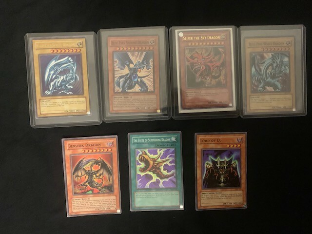 Konami Yu-gi-oh Slifer The Sky Dragon GBI-001, two Blue Eyes White Dragon SKE-001 and SDK-001, and Blue Eyes Shining Dragon MOV-EN001. Shining Dragon is limited edition! Also includes Lord of D. SDK-041, Berserk Dragon DCR-019, Flute of Summoning Dragon SDK-042. All cards are in almost perfect condition, and all are Holographic. Would like to sell as a set, but also willing to sell individually. Condition is "Used". Shipped with USPS First Class.