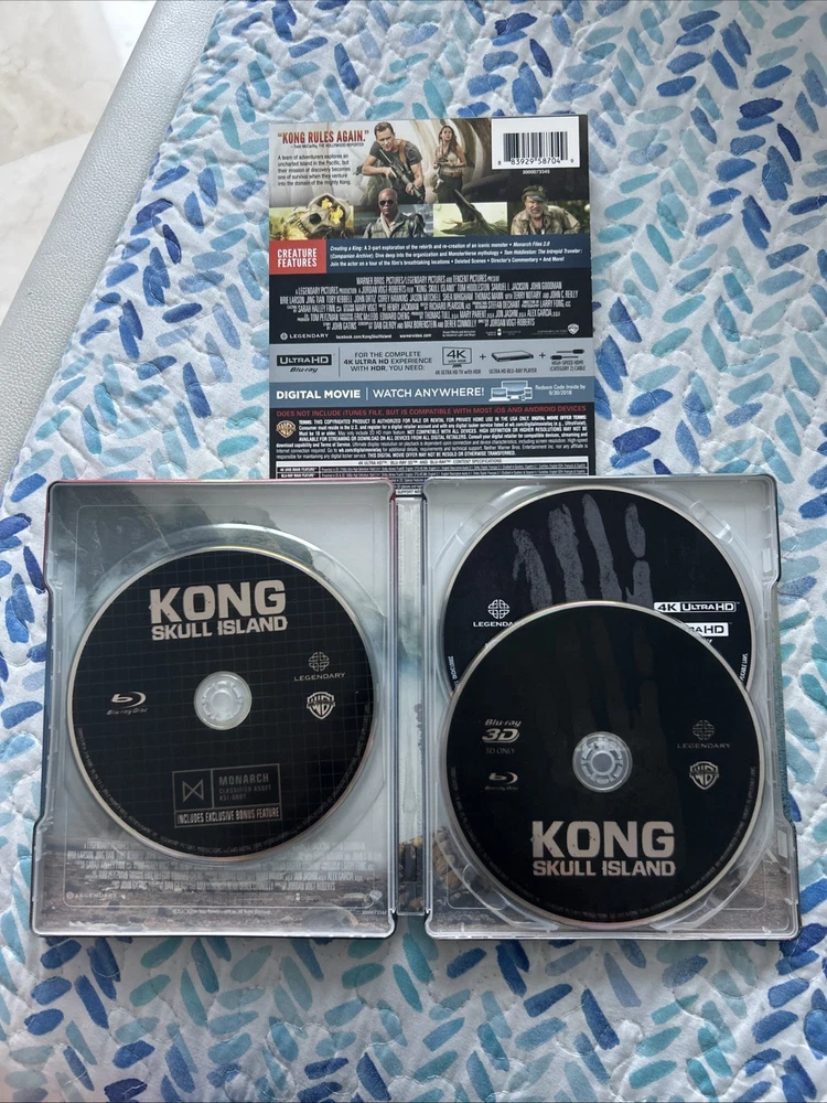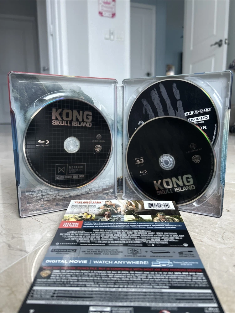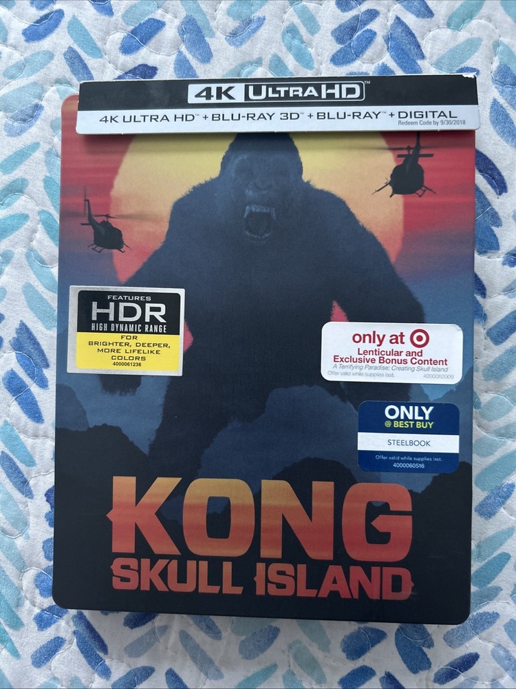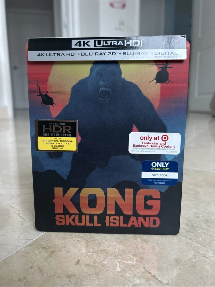 Kong: Skull Island (4K UltraHD, 3D, Blu-ray, Target Bonus, Digital, 2017) Exclusive 3-Disc Best Buy Steelbook including an Exclusive Target Bonus Content in Blu-ray Disc. The complete OUT OF PRINT, Super RARE, CUSTOM set is in pristine condition from a private collection. This set is a very unique as it combines both Best Buy and Target Stores Exclusives!!! See pictures and complete description of the set!!! Target Exclusive Bonus Blu-ray content from UPC: 883929599530. A Terrifying Paradise: Creating Skull Island featurette!!! Embark on a thrilling journey with "Kong: Skull Island" on 4K UHD Blu-ray, the gripping adventure that brings you into the MonsterVerse. This thrilling movie, released in 2017 and directed by Jordan Vogt-Roberts, features an all-star cast including Tom Hiddleston, Samuel L. Jackson, and Brie Larson. Experience the cinematic spectacle in stunning clarity with the 4K UltraHD 2160p and 3D 1080p formats. The steelbook case edition adds an extra layer of durability and collectability. Enjoy the extras with a digital copy edition that includes five behind-the-scenes featurettes, deleted scenes, and interviews. With English, French, Portuguese, Spanish, Hindi, and Mandarin subtitles, this action-packed movie is perfect for anyone looking for an adventure.