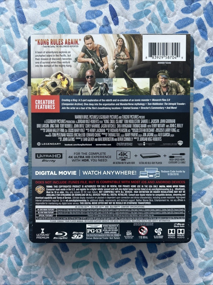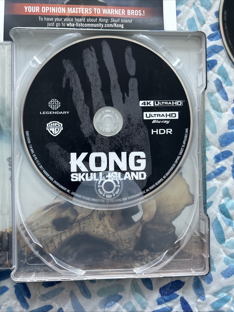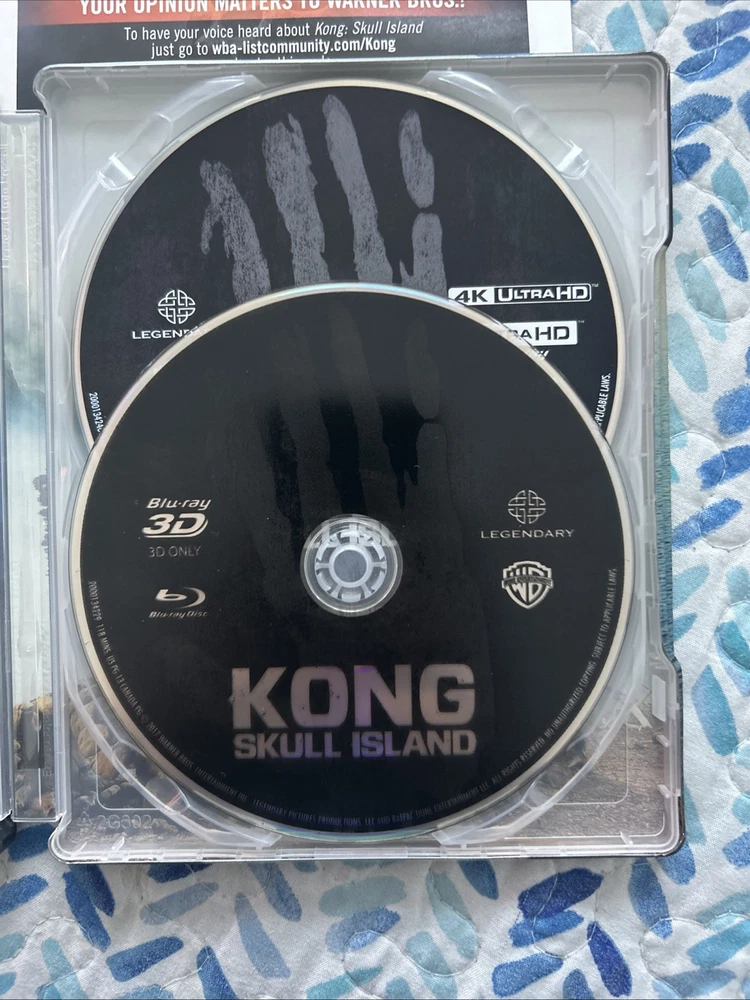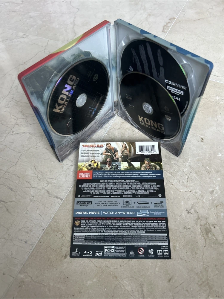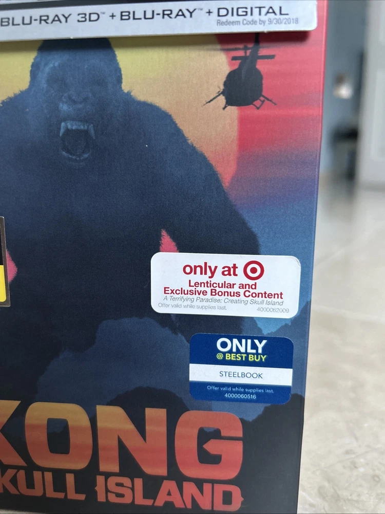 Kong: Skull Island (4K UltraHD, 3D, Blu-ray, Target Bonus, Digital, 2017) Exclusive 3-Disc Best Buy Steelbook including an Exclusive Target Bonus Content in Blu-ray Disc. The complete OUT OF PRINT, Super RARE, CUSTOM set is in pristine condition from a private collection. This set is a very unique as it combines both Best Buy and Target Stores Exclusives!!! See pictures and complete description of the set!!! Target Exclusive Bonus Blu-ray content from UPC: 883929599530. A Terrifying Paradise: Creating Skull Island featurette!!! Embark on a thrilling journey with "Kong: Skull Island" on 4K UHD Blu-ray, the gripping adventure that brings you into the MonsterVerse. This thrilling movie, released in 2017 and directed by Jordan Vogt-Roberts, features an all-star cast including Tom Hiddleston, Samuel L. Jackson, and Brie Larson. Experience the cinematic spectacle in stunning clarity with the 4K UltraHD 2160p and 3D 1080p formats. The steelbook case edition adds an extra layer of durability and collectability. Enjoy the extras with a digital copy edition that includes five behind-the-scenes featurettes, deleted scenes, and interviews. With English, French, Portuguese, Spanish, Hindi, and Mandarin subtitles, this action-packed movie is perfect for anyone looking for an adventure.