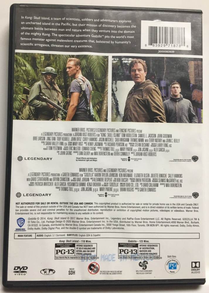 WANT IT A LOT CHEAPER?? HUGE SAVINGS!! If you are interested in Purchasing more than one of my over 5,000 Movies & CDs, SIMPLE!! Just Send Me a Message with the Items you Select and I will Make you a Wonderful Bundle Deal that you will probably not Pass Up, The More Items you Select the Bigger Deal you will Receive !! Kong Skull Island [2017] / Godzilla [2014] (DVD,2020,2-Disc Set,Widescreen) Elizabeth Olsen, John C. Reilly, John Goodman, Samuel L. Jackson, Tom Hiddleston, Brie Larson, Aaron Taylor-Johnson, Bryan Cranston Very Good Discs, Case Lightly Worn, Look at Photos!! All My Items are 100% Guaranteed to Play Perfectly or your Money Back!! PLEASE VIEW PICTURES!! THEY SPEAK A THOUSAND WORDS!! ASK QUESTIONS BEFORE PURCHASING!! Optional USPS Ground Advantage Postal Upgrade only $3.99!! (The USPS did away with First Class Package Service, This is what Replaced it) NOTE: The USPS has been having delays nationwide and have impacted delivery times on some orders 90% of all orders have no delays and arrive before the estimated delivery date The FREE SHIPPING expected delivery with tracking is normally 3-8 business days but IF delayed by USPS, orders may take much longer I ship all orders no later than the next business day after they are received Unfortunately, once shipped the delivery date is out of my control since I am no longer in possession of item PLEASE CONSIDER POSSIBLE USPS DELAYS BEFORE PURCHASING!!! I wanted to make all prospective buyers aware before ordering, that once I ship your item through USPS that I cannot do anything else to speed your package up ! BUY A FEW,SAVE BIG! Promotions!! (Have to click on the promotion at the bottom of the page and has to be shipped to same address) SAVE $8 for every 4 items you Purchase OR SAVE $ 15 for every 7 Items you Purchase Have a Great Day!! Please check the pictures of the actual item for quality If Offered, There is no Guarantee that Digital copy code is not expired, used or even included What is pictured is what you get, Please ask questions if you need more information Don't be fooled by all the other listings with Stock Photos, Know what you are buying!! Increase your Savings by purchasing More than One Item!!! I regularly have Promotional Offers that include a Substantial Discount for Purchasing more than one of my already heavily discounted Items. You will see these Promotional Offers at the top of most every one of my listings. All you have to do is click on the Promotional Offer and pick the additional Items you would like to capitalize on the great discounts described in the offer Save Money on Shipping!! If you're like me and you want your item shipped quicker than Media Mail, I have heavily discounted the quicker Shipping Methods for you on most Items!! So go ahead and get your Item SUPERFAST and save a load of CA$H as well!!