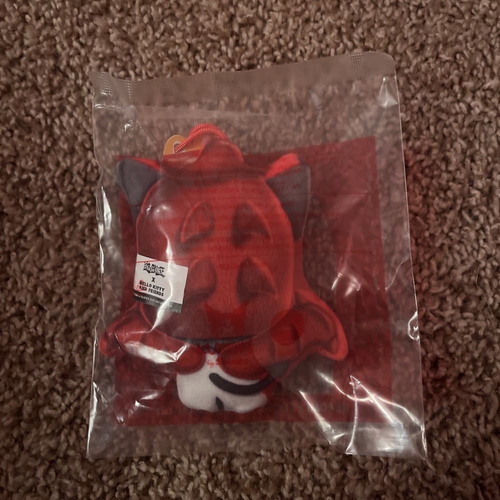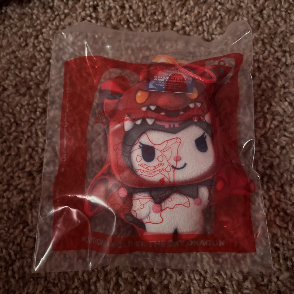 The product is a limited edition plush toy featuring characters from the Yu-Gi-Oh! TV show and Hello Kitty franchise. Specifically, it is a collaboration between McDonald's and Sanrio, showcasing characters Kuromi and Slifer the Sky Dragon in a red color scheme. Manufactured in China for the year 2024, this unique collectible item appeals to fans of both Yu-Gi-Oh! and Hello Kitty, making it a sought-after piece of animation merchandise for collectors.