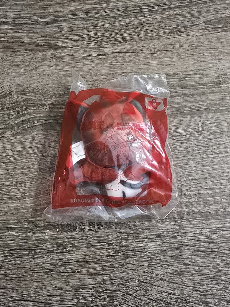 This product is a collectible plush toy made by McDonald's in 2024. It features the characters Kuromi and Slifer the Sky Dragon from the Yu-Gi-Oh! franchise. The plush is made of red material and was manufactured in China. It is part of the Hello Kitty collection and is designed for fans of the Yu-Gi-Oh! TV show.
